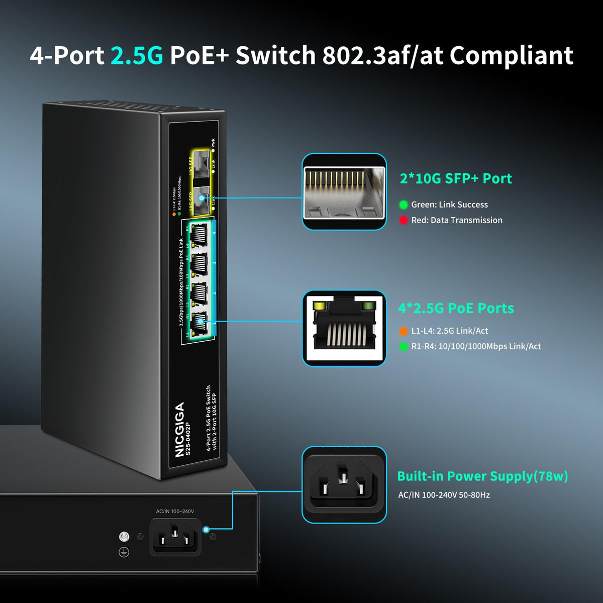 4 Port 2.5G Poe Switch Unmanaged With 4 X 2.5Gb Base T Poe+@78W + 2 X 10G Sfp Uplink, 2.5Gbe Ieee802.3Af/At Power Over Ethernet
