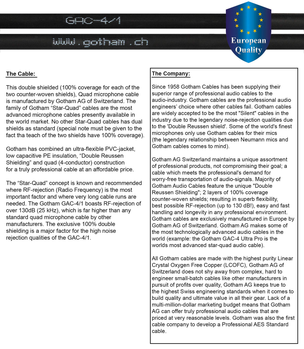 Q: How should I maintain my Gotham GAC-4/1 microphone cables for longevity?A: To maintain your Gotham GAC-4/1 microphone cables, avoid bending or twisting them excessively, store them in a cool, dry place, and clean the connectors regularly with a dry cloth to prevent corrosion and ensure optimal performance.