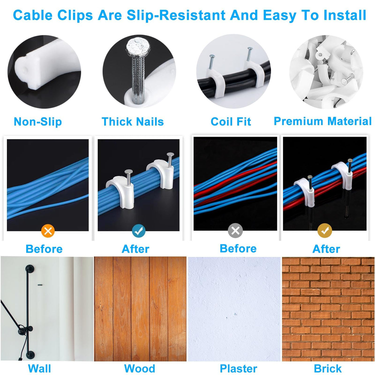 Are You Looking For A Cable Management Solution That Easily Manage All Your Cables At Home Or In The Office? Look No Further Than Our Cable Clips With Steel Nail!&Nbsp; Massive Quantity: Our Cable Clips For Cords Come In Packs Of 400 Pcs A Per Set, 100 Pcs Per Size With Wire Clips Of 4 Mm, 6 Mm, 8 Mm And 10 Mm, You Will Have The Enough Quantity Coaxial Nail Clamps For Meeting Your Different Needs. Premium Material: Our Cable Tacks Are Made Of Premium Stabilized Plastic And Hardened Nails, Making Nail In Cable Clips Very Difficult To Break. And Our Ethernet Nail Clips Have Strong Bearing Capacity, Corrosion Resistance, Ageing Resistance And Good Insulation Performance. Coax Cable Clips Have Long Enough Nails To Get The Job Well Done, And Wire Wall Clips Will Never Slide Out Or Loosen. Easy To Use: The Surface Of Each Cable Clips With Steel Nail Has A Clear Size Mark, Which Is Convenient For You To Quickly Identify A Suitable Cable Clips When You Use Coaxial Cable Clamps. Nail Wire Clips Can Be Easily Installed By Simply Positioning The Cable Nail Clips For Wires And Using A Hammer To Tap Nail For Cable Clips Nail Into A Surface Of Wood, Plaster, Brick, Etc. Variety Of Uses: Nail Cable Holders Can Flexible For Cable Management Of Multiple Electric Device Cables Of Varying Widths Including Usb Cables, Tv Cable, Telephone Cable, Computer Power Cords, Print Cable. Cable Wire Clips Also For Rg6, Rg59, Cat6, Rj45 Cable, Coax Cable, Ethernet Cable, Satellite Dish Wires, Vga Video Cable And Etc. Best Choice: Our Ethernet Wire Clips Durable And Well Made, Attached Well To Cable Hook Wall. Cable Wire Clips Can Help Those Cluttered Cords On The Floor Much Cleaner And Safer. You Can Experience The Quality And Reliability Of Our Cable Clips With Steel Nail For Yourself! You Will Get The Best Cable Management Solution Available And Enjoy A Cleaner, More Organized Workspace!