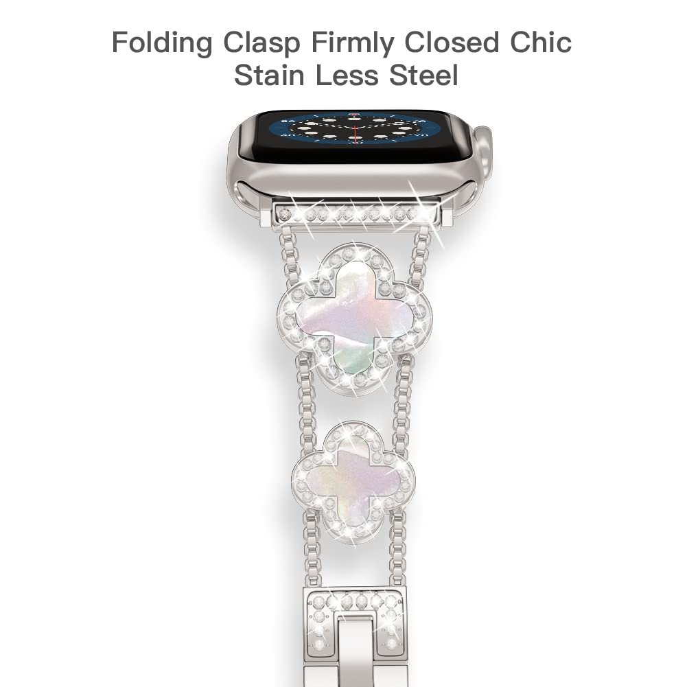 Unique Design] This Luxury Apple Watch Band Features The Most Popular Four-Leaf Clover Design, It Symbolizes Luck And Hope This Rose Gold Apple Watch Band Uses Diamond-Encrusted Craftsmanship, Revealing Dignity And Elegance In Luxury Youll Get A Lot Of Compliments Because Of It, And Its The Perfect Combination Of Personality And Style Metal Apple Watch Band] This Diamond Apple Watch Band Made Of High-Quality Metal Material, With Shiny Rhinestone Decoration, Well Polished, The Surface Is Treated With High-Quality Protection Process, Waterproofsweat-Proof, Sturdy And Durable, Bringing You A Great Wearing Experience A Great Gift For All Kinds Of Watch Strap Lovers, Suitable For Different Outfits And Occasions Compatible Apple Watch] This Cute Apple Watch Band Is Compatible With All Apple Watch Models Bling Apple Watch Band Compatible With Apple Watch Band 38Mm 40Mm 41Mm 42Mm 44Mm 45Mm It Is Compatible With Series 7Series 6Series 5Series 4Series 3Series 2Series 1Se Easy Removal Link] The Slim Apple Band Can Be Resized Without Tools, You Can Easily Remove The Extra Apple Band Link By Hand, It Fits Wrist Size Of 53-75 Inches Fits Your Wrist Perfectly Perfect For Everyday Use, Holiday Parties, As A Gift For Weddings, Birthdays, Valentines Day, Mothers Day, Christmas, Thanksgiving, Etc Attentive Service] We Will Provide A 2-Year Quality Guarantee For This Product Any Time You Have Any Questions About This Apple Watch Band, You Can Contact Us At Any Time, And We Will Solve The Problem For You In Time