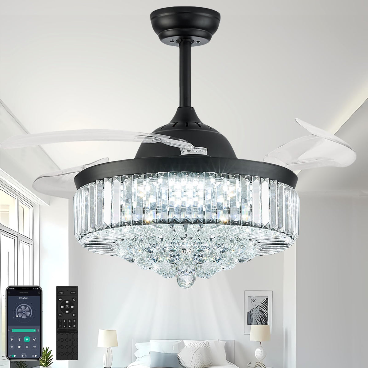 42'' Fandelier Ceiling Fans With Light, Chandelier Ceiling Fan, Retractable Crystal Ceiling Fan For Bedroom, Living Room, 3 Colo