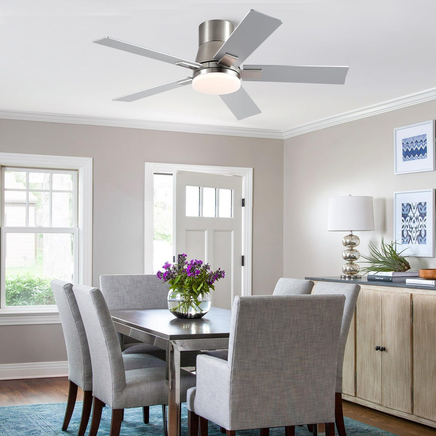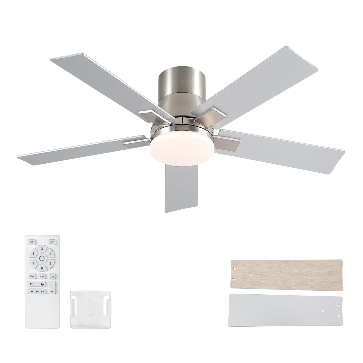 42 Inch Ceiling Fans With Lights And Remote,Flush Mount Silver Ceiling Fan With 5 Blades,6 Speed Reversible Dc Motor,3Cct Dimmab