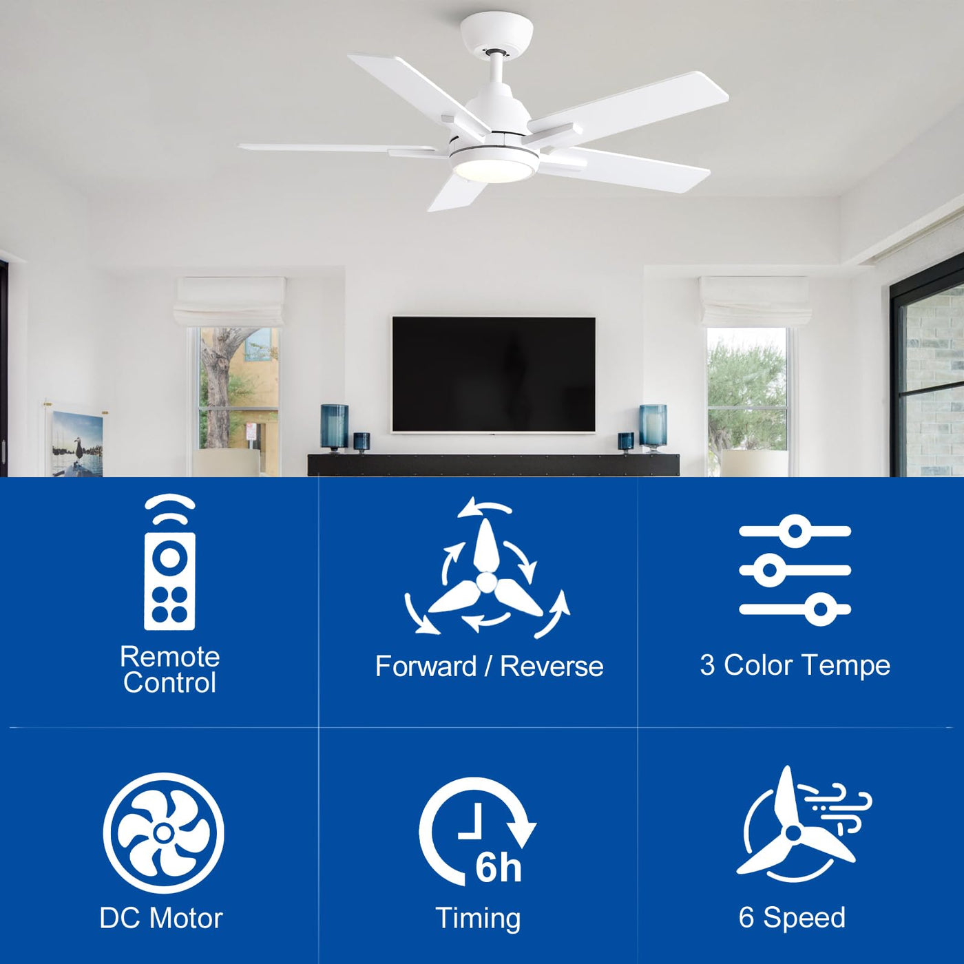 • Q: How does the remote control function work for this ceiling fan? A: The ceiling fan comes with a convenient remote control that allows you to adjust fan speed, control the LED light (including three color temperature settings), activate the reverse mode for year-round use, and set timers for 1, 3, or 6 hours. The remote can also be mounted on the wall for easy access.