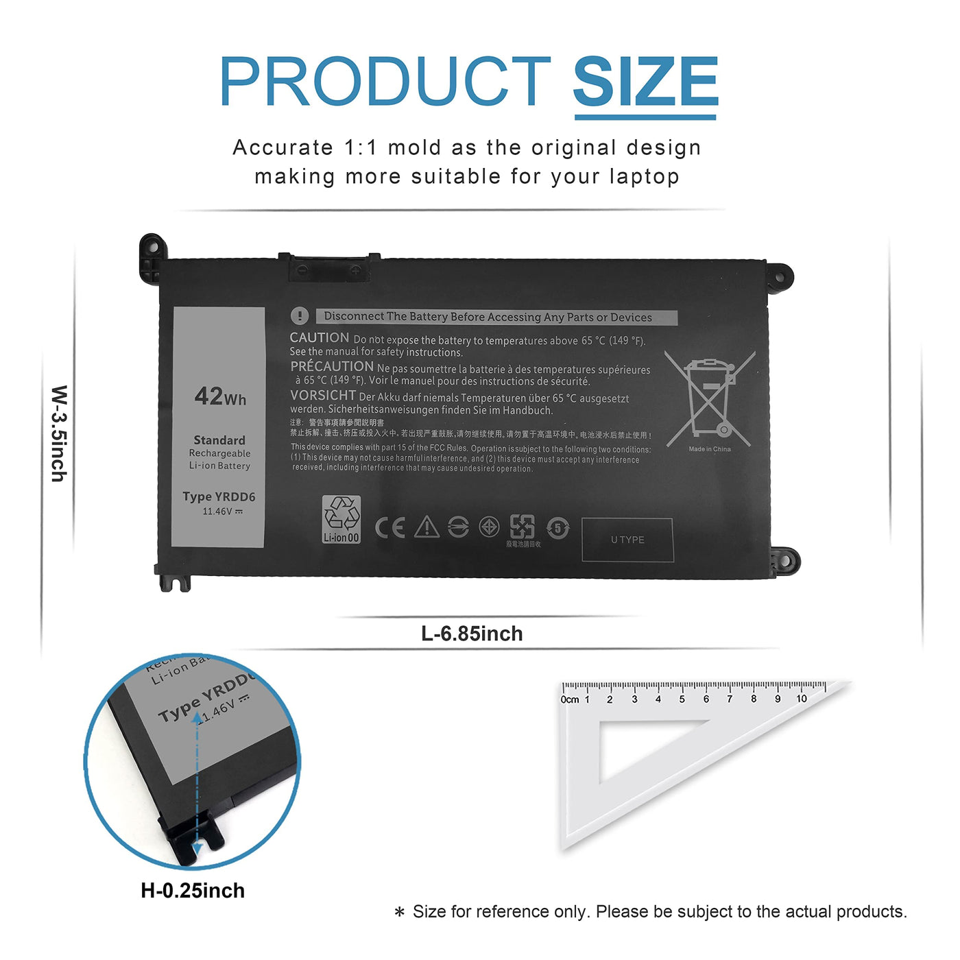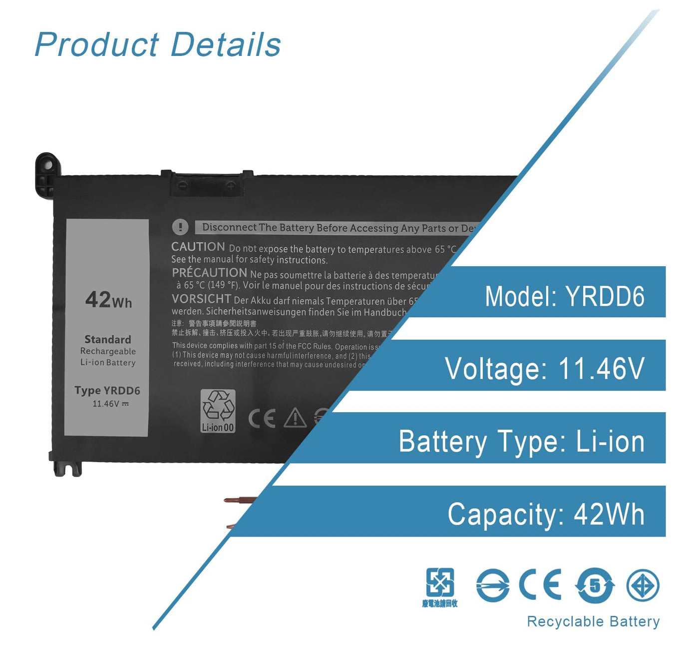Q: What is the capacity and voltage of the YRDD6 VM732 battery?A: The YRDD6 VM732 battery has a capacity of 42Wh and operates at a voltage of 11.4V. It is designed as a Lithium-ion battery with a 3-cell configuration, ensuring reliable power for your laptop.