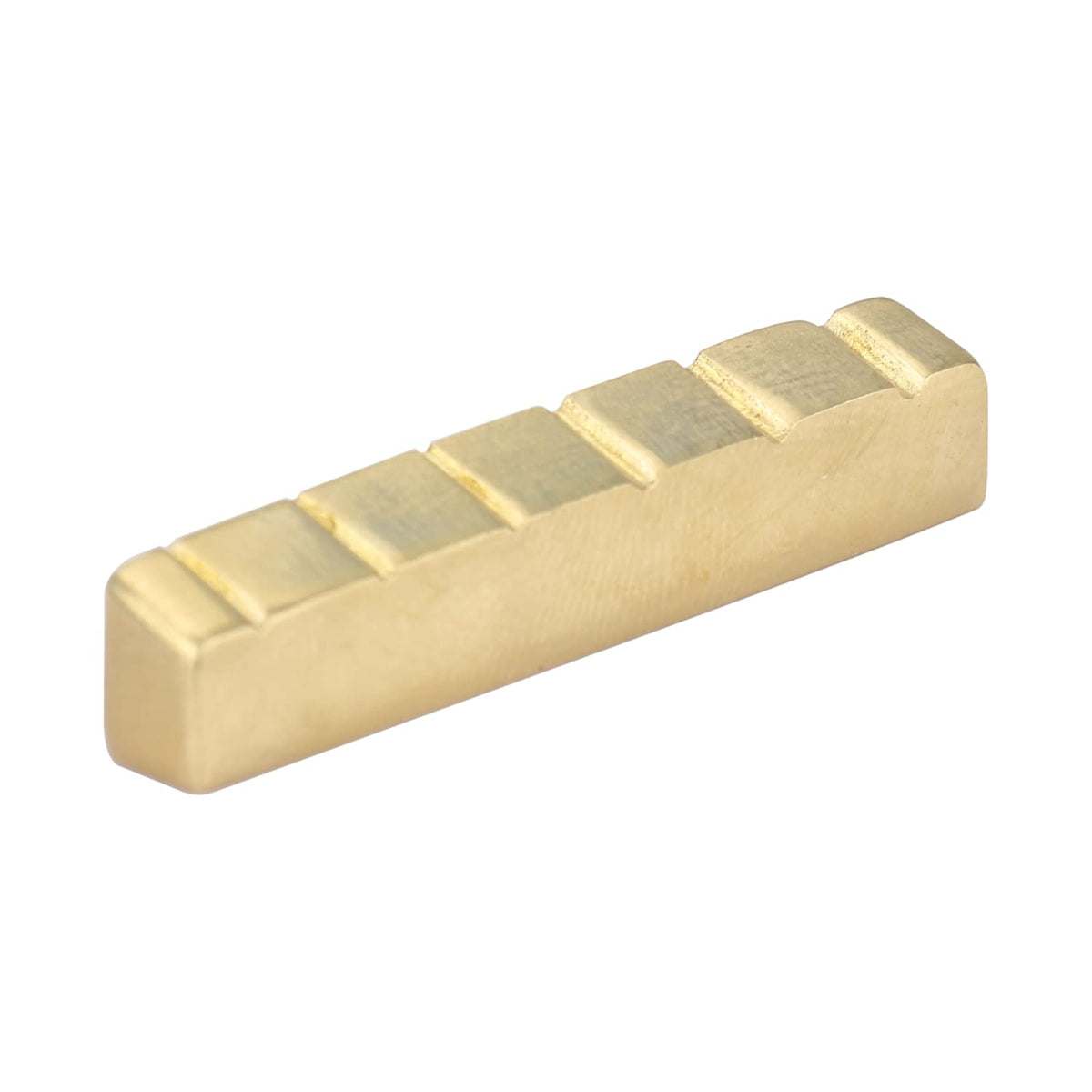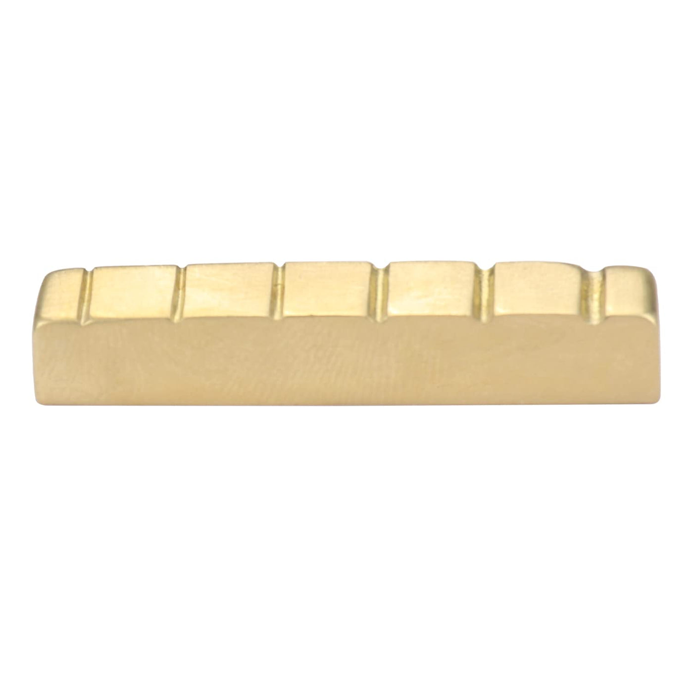 It Has A Flat Bottom And Is Pre-Slotted For A Quick And Simple Install. High Density And Minimal Porosity That Yields Good Intonation And Clarity. Lightweight Design, Exquisite Appearance, And Easy To Use. Great Replacement Nuts For Your Acoustic Guitar, Electric Guitar, And Most Electric Bass Guitars. Compatible With Gibson Les Paul (Lp), Sg Models, Epi Guitar. Pre-Slotted With String Location Grooves To Make Spacing And Positioning A Breeze When Performing The Final String Slot Filing. Color: Brass Material: Solid Brass, Durable And Compact. Measurement: Length: 43 Mm (1.69 Inch) Thickness: 6 Mm (0.24 Inch) Height: 8 - 8.7 Mm (0.31 - 0.34 Inch) E String To E String: 35 Mm (1-3/8 Inch). Please Check The Parameter Drawing In The Attached Pics Before Placing Your Order.