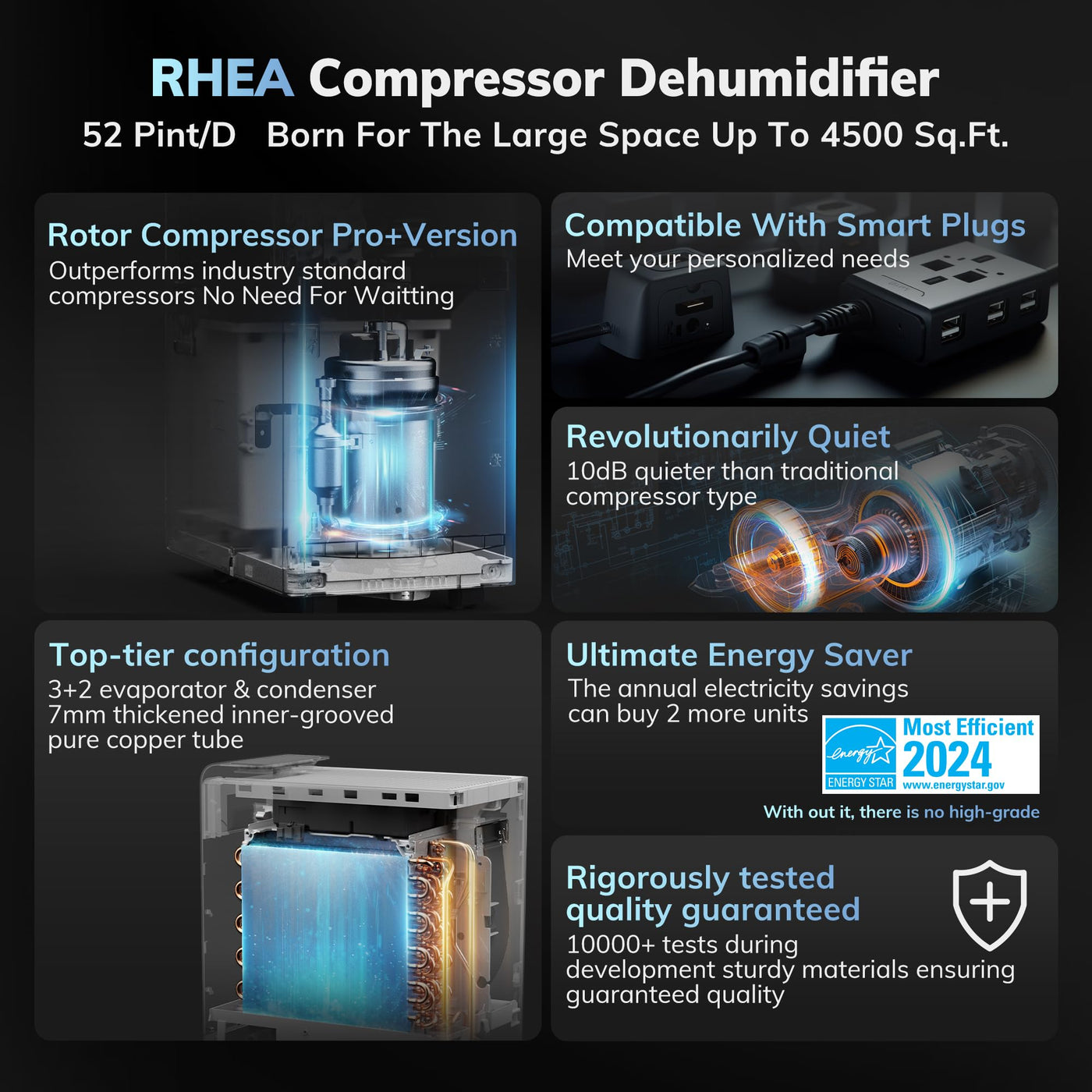 4500 Sq.Ft Most Efficient Energy Star 2024 Dehumidifier,Aeocky 52 Pint Smart Compressor Dehumidifier With Drain Hose, Intelligen