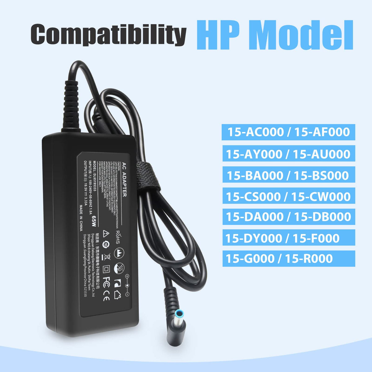 Q: What laptops are compatible with the 45W 65W Laptop Charger?A: The 45W 65W Laptop Charger is compatible with a variety of HP 15 Notebook models, including 15-AC series, 15-AF series, 15-AY series, 15-BA series, 15-BS series, 15-DA series, 15-DB series, and 15-DY series, among others. It also supports HP Pavilion 15 Series and HP 17 Notebook models.