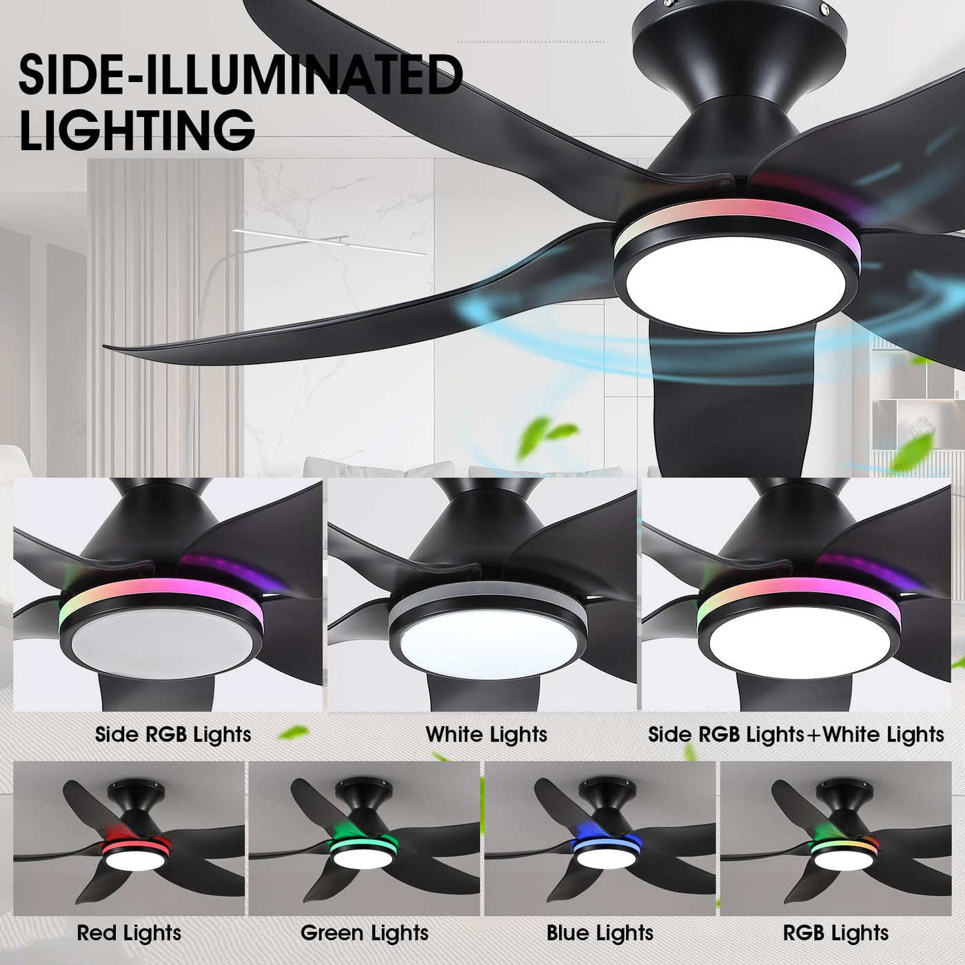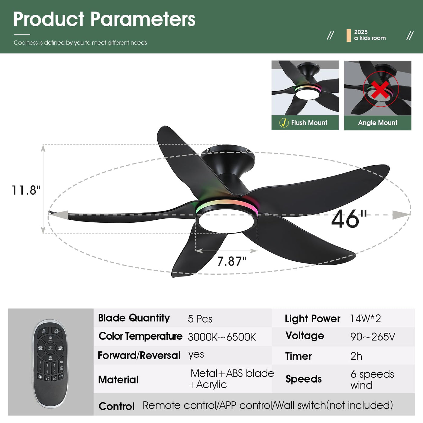 ?Independent Rgb Ring Light? This Kviflon Upgraded 5-Blade Ceiling Fan Has A Diameter Of 46 Inches, The Lights Is Divided Into 3-Color White Lights And The Side Of The Rgb Aperture, You Can Use The Remote Control Or Cell Phone App To Independently Control The 2 Kinds Of Lights. 14 Type Of Rgb Lighting Variations To Choose From, Creating A Beautiful Ambiance, Widely Adapted To The Needs Of Various Occasions, Such As Bedroom, Dining Room, Kids Room, Bar, Game Room, Etc., Very Unique. | ?Modern Flush Mount Ceiling Fan Light?With A Sleek And Modern Design, This Kviflon Ceiling Fan Fits Perfectly With Any Contemporary Decor. Measuring Just 11.8 Inches In Height After Installation, It Is Well Suited To Low Profile Spaces. The Fan Blades Have An Unfolding Diameter Of 46 Inches And Feature A Propeller Design That Moves A Lot Of Air, Can Be Used In Both Large And Small Rooms. | ?Reversible Dc Motor?This Ceiling Fan Features A Reversible Dc Motor, Which Can Work In Both Directions, And This Helps With The Airflow, Whether You Just Want To Keep The Room Cool In The Summer Or Circulate Warm Air In The Winter, It Gets The Job Done. | ?Remote & App Control?Remote Control Functions Include 6-Speed Wind, 3 Color Temperatures And Endless Dimming, Rgb Light Mode, One-Click On Night Light Mode, 2-Hour Timing Off (Fan Only), Separate On/Off Lights Or Fans And So On. You Can Also Download App To Realize These Functions On Your Phone. It'S Very Convenient To Meet Your Needs For Fan Speed And Lighting In Different Scenarios Without Having To Get Up. (Tips: App Download And Instruction Video Can Be Viewed On The Product Page) | ?High Quality?This Ceiling Fan Is Made Of High-Quality Abs Material And Metal, Which Is Strong And Durable. The Fan Motor Adopts Pure Copper Motor, Which Has The Characteristics Of Strong Power And Low Noise. The Light Source Adopts Led Light Source, Which Features Low Energy Consumption And A Long Service Life. | ?Low Noise Experience?This Ceiling Fan Operates Quietly, Providing A Comfortable Breeze Without Any Annoying Noise. The Noise Level Is Less Than 35Db, Whether You'Re Listening To Music, Reading A Book Or Even Sleeping, You Won'T Be Disturbed. | ?Easy Assembly & Installaition?This Ceiling Fan Is Very Easy To Assemble And Install, And We Have A Detailed Installation Video On Our Product Page, Providing Users With An Efficient And Practical Installation Method. The Item Comes With Safety Rope, It Can Be Easily Installed By Just One Person. | ?After-Sales Service?If You Have Any Problems During Installation Or Use, Please Do Not Hesitate To Contact Us. Our Professional Team Will Provide Prompt After-Sales Support And Assistance To Ensure That Your Problems Are Resolved In A Timely Manner.