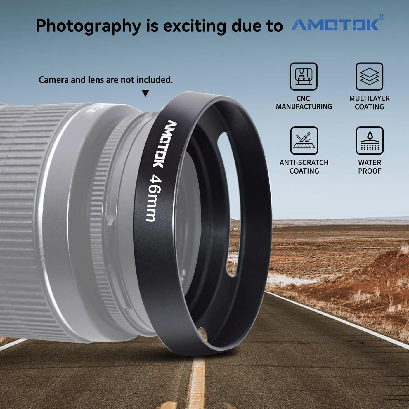 (The Camera Is Not Included And Lens) Product Description Brand: Amotok Material:Space Aluminum Model Number:46Mm Metal Lens Hood It Is 100% Brand New And Quality Is Guarantee.Top Of The Line Quality,Adapter Using Ultra Precision Cnc Machine Tools,Sophisticated Material,High Intensity, Good Operation Stability. Function: The Hood Is Made Of Quality Metal Material, Sturdy, Anti-Rust And Durablethe Inner Surface Is Coated With Matte Paint, Can Decrease Reflection To Improve Image Qualitycan Keep Rain And Snow Away From The Lens And Avoid Fingerprints From Smudging The Lens For Better Care For Your Camera Useful Accessory For Photographer Lovers Package Includes: 46Mm Metal Lens Hood *1 (Original Manufactory Package)