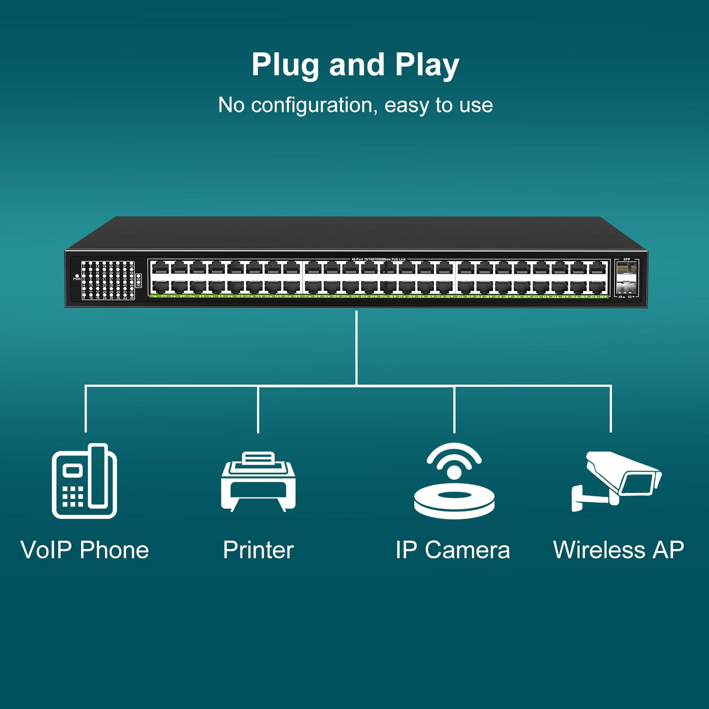 48-Port Gigabit Poe Switch Unmanaged With 2X 1000Mbps Uplink Sfp Port, Vimin 50-Port Poe Ethernet Switch Support Ieee802.3Af/At, 400W Power, Plug And Play, Metal Case, Rack-Mount