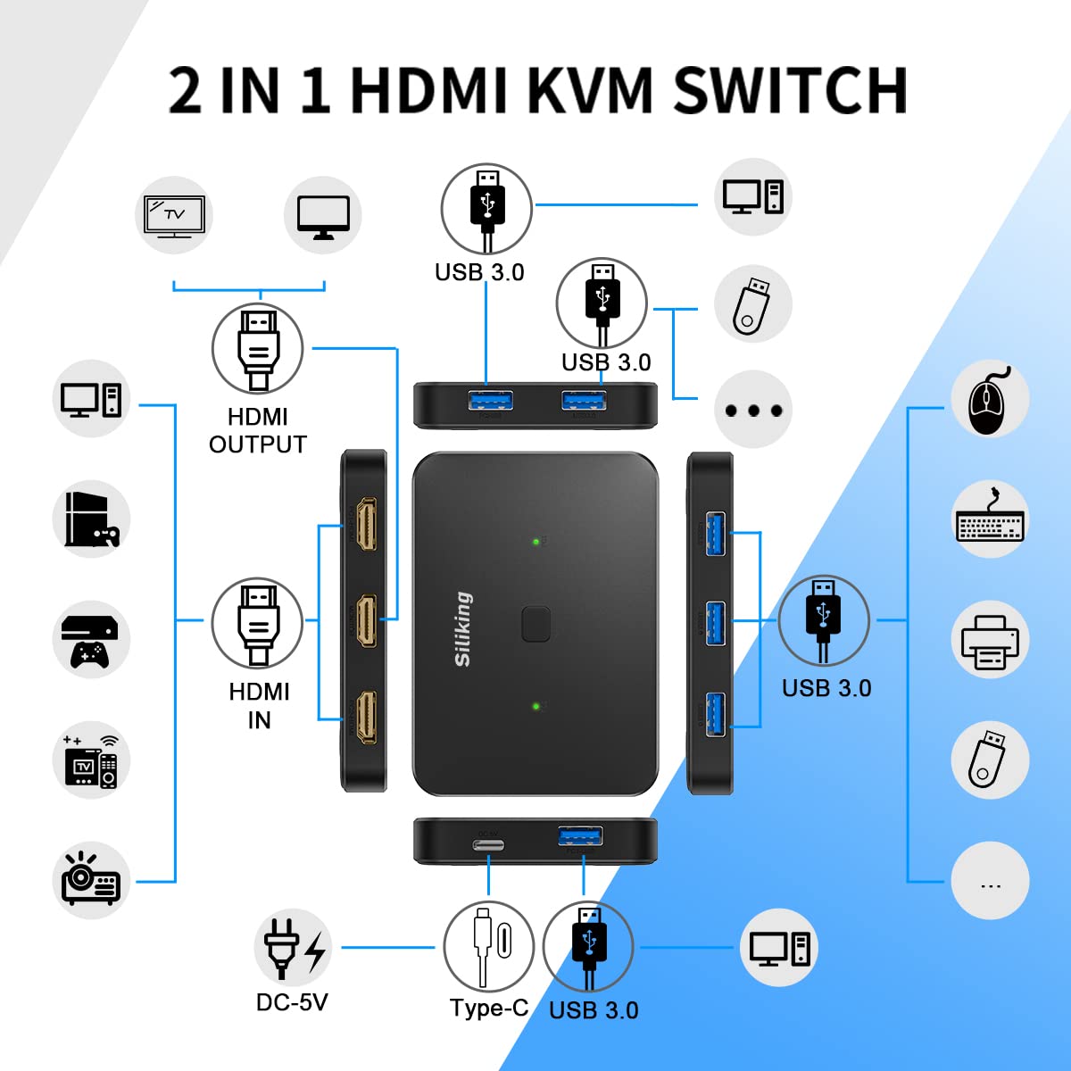 Q: How many USB ports does this KVM Switch have, and what can I connect to them?A: This KVM Switch features 4 USB 3.0 ports that allow you to connect and share peripherals such as a keyboard, mouse, printer, camera, and external hard drives between two computers.