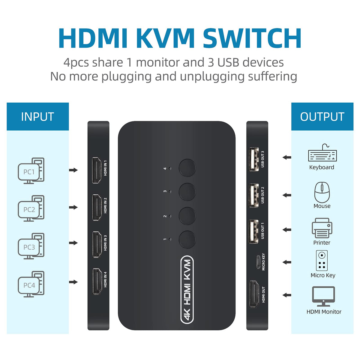 4K Hdmi Kvm Switch, 4 Port Hdmi Usb Switch For 4 Computer Share A 4K@30Hz Monitor And 3 Usb Device Keyboard Mouse Printer, Inclu