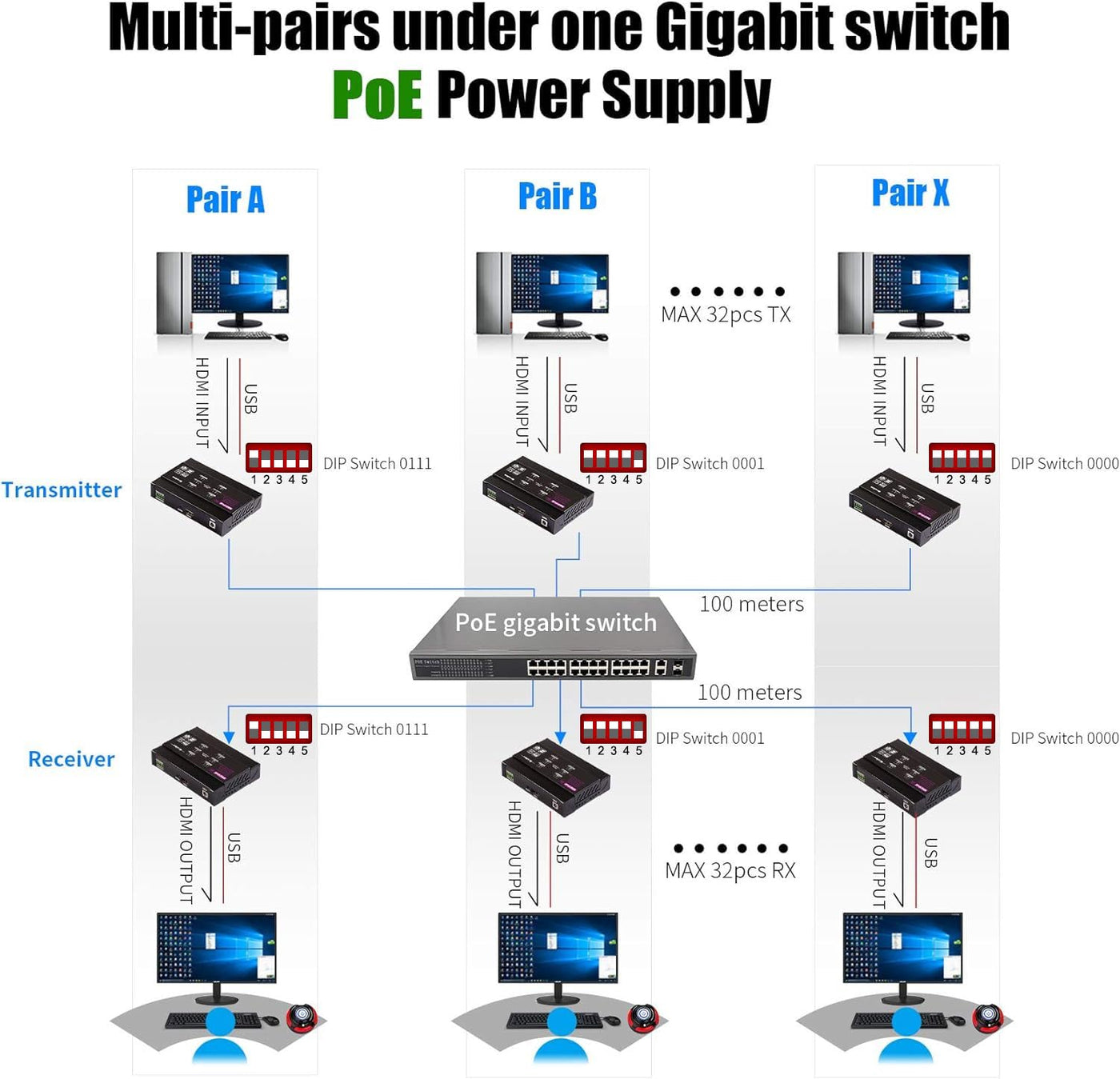 • Q: What is the maximum distance the Basicolor 4K PoE HDMI KVM Extender can transmit signals? A: The Basicolor 4K PoE HDMI KVM Extender can transmit signals up to 328 feet (100 meters) over Cat5e or Cat6 cables.