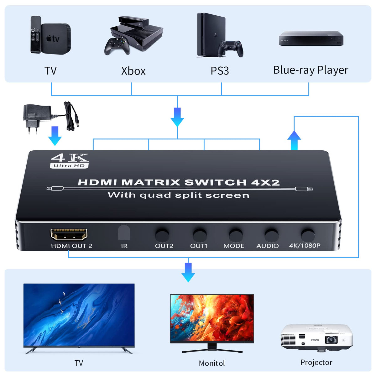 Important Note: There Are 2 Options, Please Check The Features And Specifications Carefully. 1) The 4K Resolutions Mean The Switch Comes With Scaler And It Can Scale The 720P/1080P Or Lower Resolutions To 4K@30Hz For Better Compatibility. Only Refers To The Resolution, The Video Quality Cannot Be Improved. 2) Under Multi-Viewer Mode, The Actual Video Quality Regarding The Watching Experience, Might Be No More Than 1080P As It Compresses The Video Source To Display Them In A Single Display. 3) The Seamless Switch Is Only Working Under The Full-Screen Mode And Both 4 Hdmi Inputs Must Be 1080P@60Hz. 4) If You Choose The 4X2 Matrix Viewer Model, The Seamless Switch Is Only Available With Output 1. 5) If You Choose The Hdmi Matrix Multiviewer Model, The Viewer Function Is Only Available With Output 1. Hdmi Quad-Screen Multiviewer: The 4 In 1 Out Hdmi Multi-Viewer Displays Video From One, Two, Three, Or All Four Hdmi Sources At The Same Time. Connected Up To 4 Hdmi Audio/Video Sources And Displays Them Simultaneously On A Single Hdmi Tv, Monitor, Or Projector. 4X2 Hdmi Matrix Multi-Viewer Switcher With Remote Control: The 4 In 2 Out Hdmi Matrix Multi-Viewer Comes With A Button And Remote Control. The Included Remote Control Allows You To Toggle Between Display Modes With Ease. Hdmi Seamless Switch Switcher: This Hdmi Matrix Quad-Split Multi-Viewer Switcher Can Work As A Seamless Hdmi Switch When All 4 Hdmi Inputs Are 1080P@60Hz. Wide Compatibility: For Instance, Connect A Media Server, Blu-Ray Player, Security Camera, And Xbox To Your Hdtv, And Watch The Video Transmission From All Four Simultaneously With Built-In Ir Control. Package Includes: Hdmi 4X2 Matrix Switcher X1 Remote Control X1(No Battery) Dc Power Adapter X1 User Guide X1