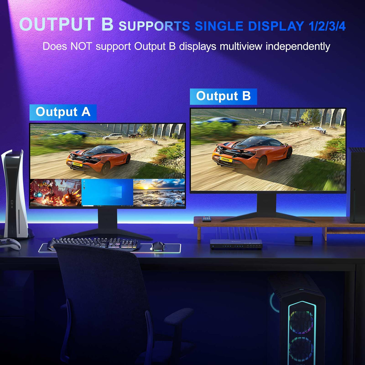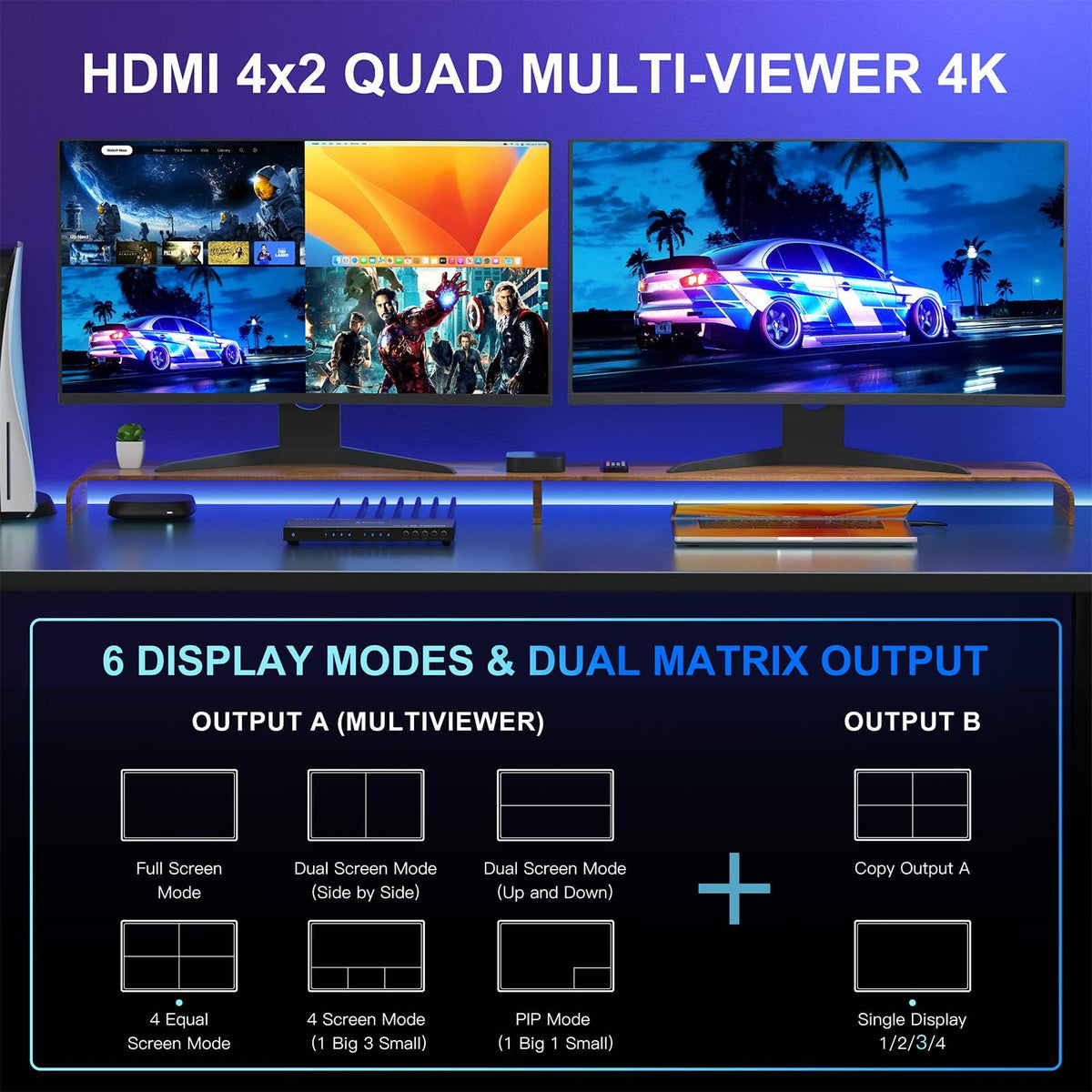 4K Hdmi Multiviewer Switch 4X2 With Pip, Portta Quad Multi Viewer Seamless Switcher 4 In 2 Out With Toslink, 3.5Mm Audio Output Support 4K 30Hz, 6 Viewing Modes, Downscaler For Ps4/Pc/Dvd/Security Camera.