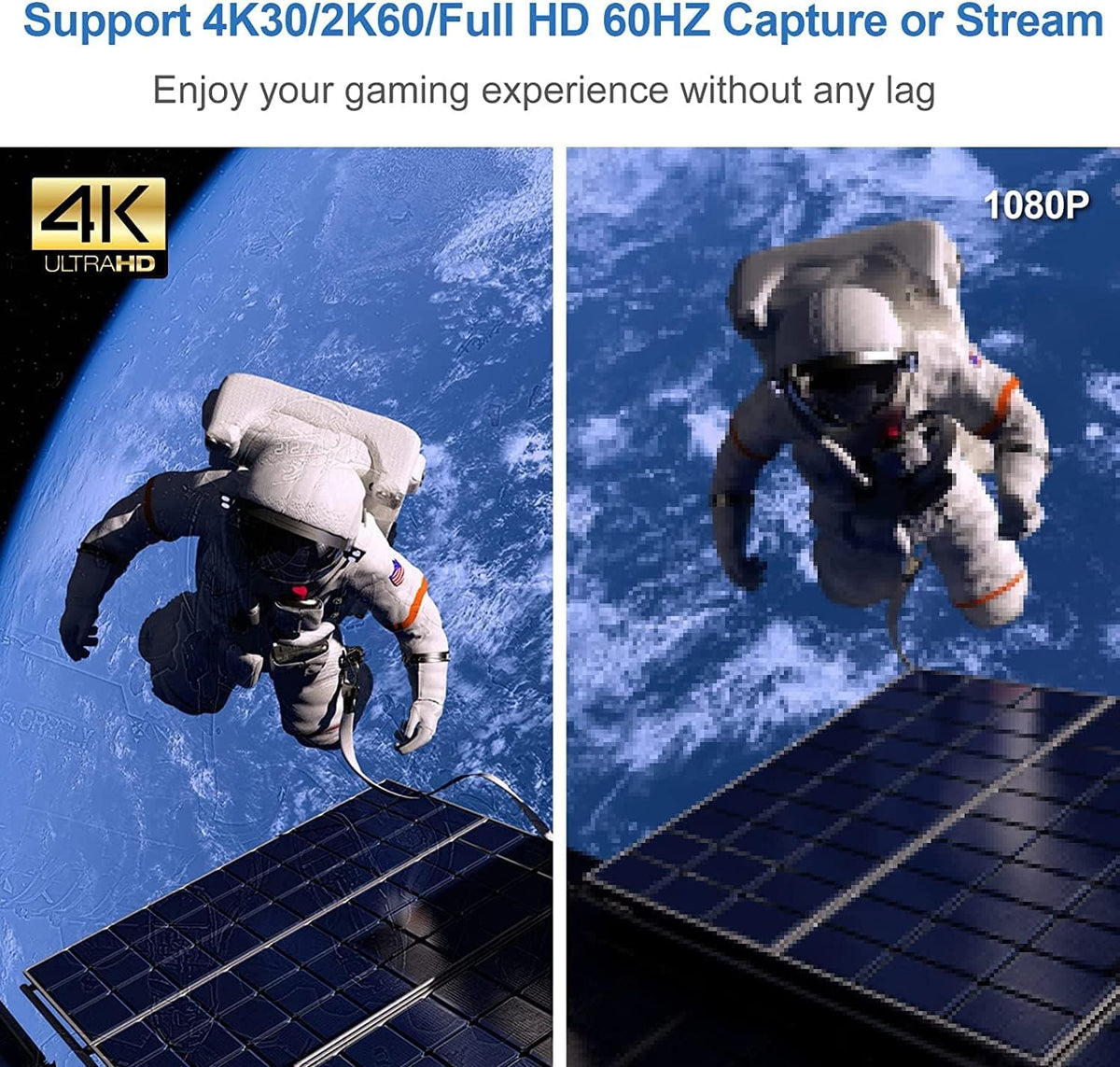 Q: What resolutions does the 4K HDMI Video Capture Card support?A: The 4K HDMI Video Capture Card supports up to 4K 30fps High Definition HDMI input, with a maximum resolution capture of 4K at 30Hz.