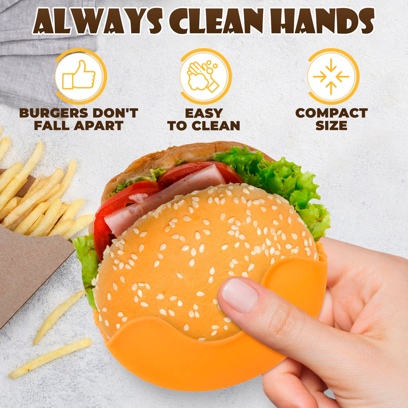 Q: Is the burger holder adjustable to fit different sizes of burgers?A: Yes, the silicone burger holder is adjustable and retractable, allowing you to fit various sizes of burgers and even add extra toppings or condiments comfortably.