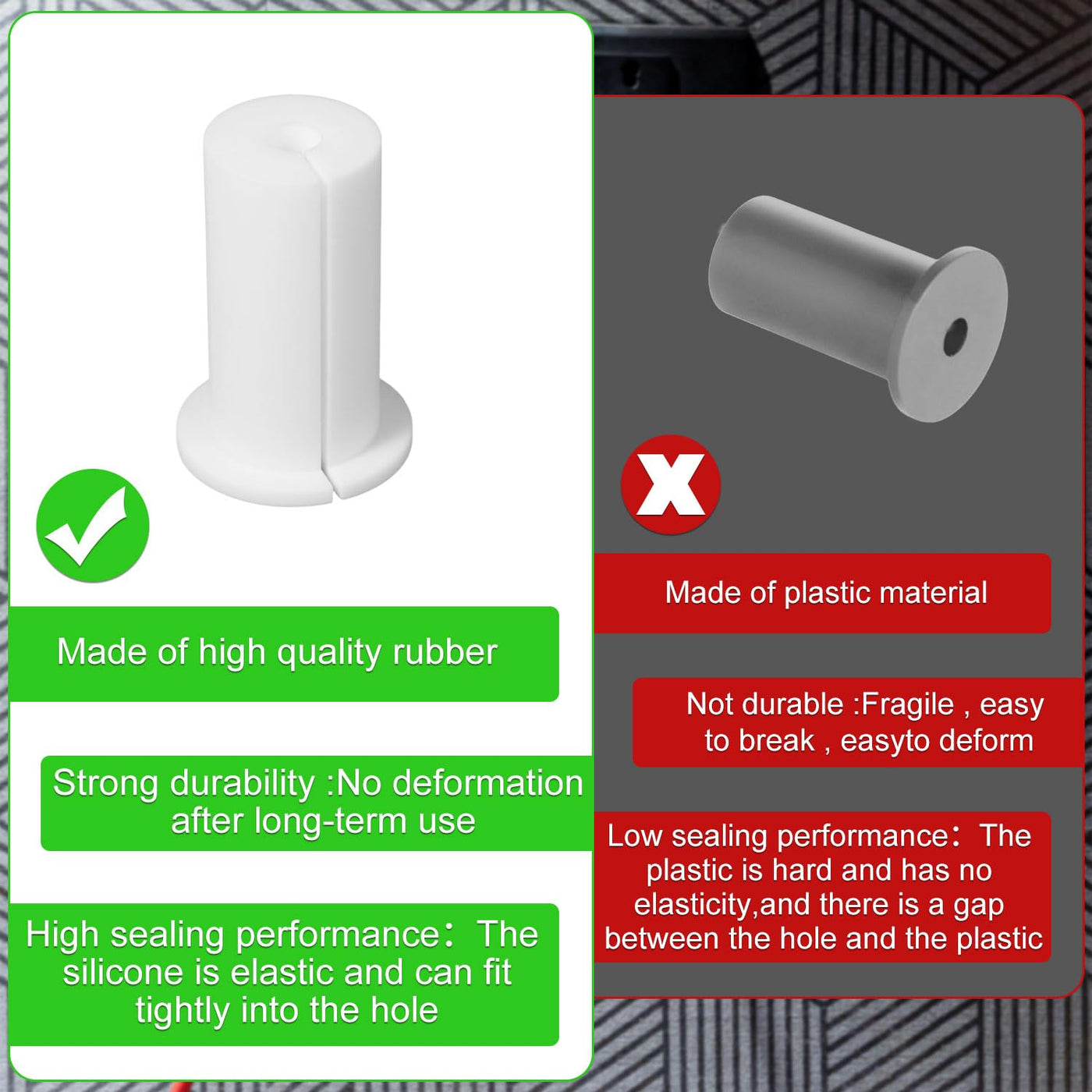 Specification: Main Color: As Seen As Picture; Main Material: Silicone; Product Size: 5X3.5X2.5Cm/1.97X1.38X0.98 Inch; Package Details: 4 X Cable Feed Through Bushings; Note: Due To Manual Measurement, The Size And Weight May Have A Certain Error. Due To The Difference Between Monitors, There May Be A Slight Color Difference.