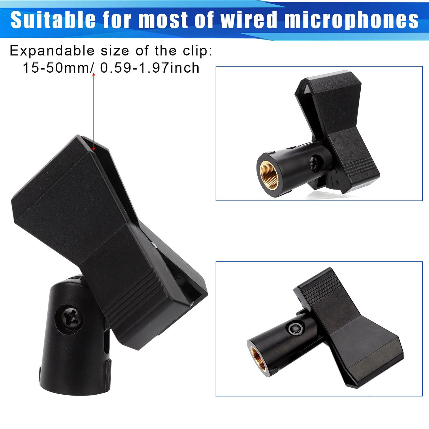 Specification: Color:Black, Gold Material:Plastic, Copper Product Size: Clip Size: 15-50Mm/ 0.59-1.97In Adapter Size: 5/8(15.5Mm) Male To 3/8(9.5Mm) Female Package Details: 4 X Microphone Clip 4 X Screw Adapter Note: Due To Manual Measurement, The Size And Weight May Have A Certain Error. Due To The Difference Between Different Monitors, There May Be A Slight Color Difference Existed.