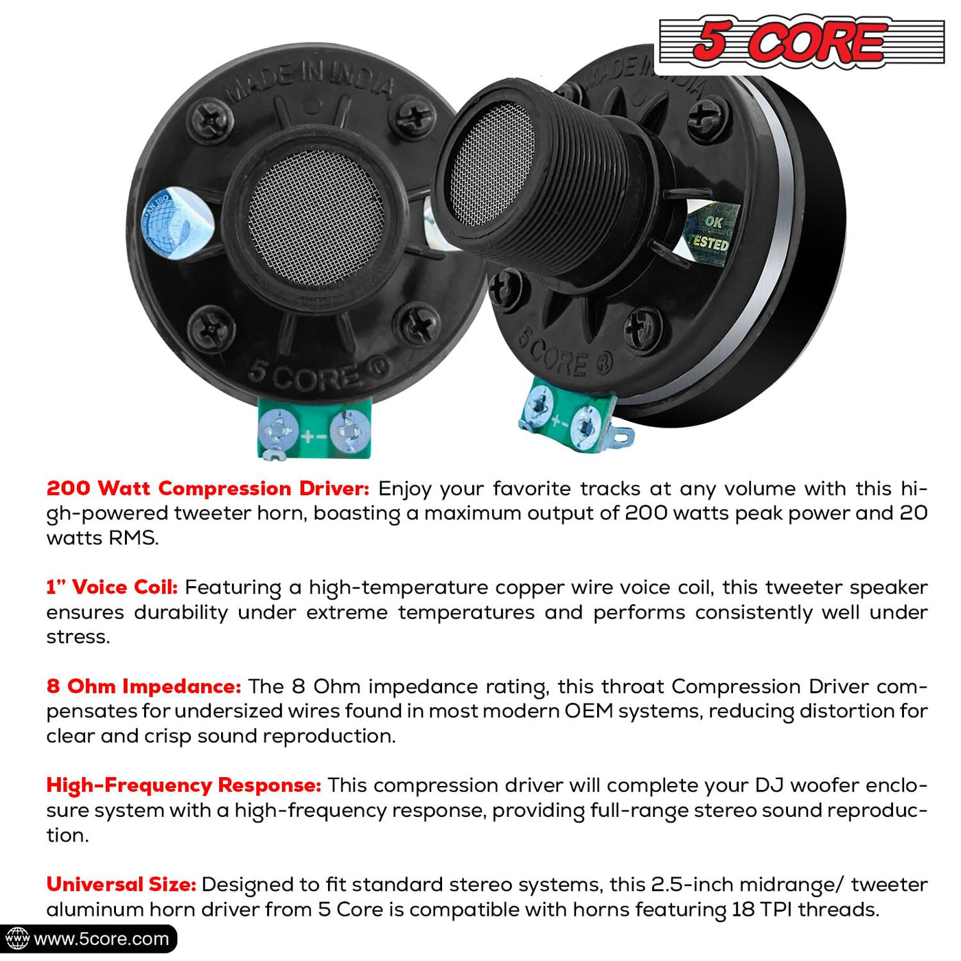 Q: Is the 5 CORE Compression Driver compatible with my audio system?A: Yes, it features a standard 8 Ohm impedance, making it compatible with most amplifiers and DJ PA audio systems.
