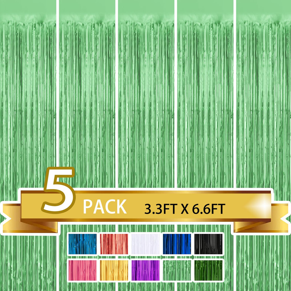 Q: What are the dimensions of the Light Green Metallic Tinsel Foil Fringe Curtains?A: Each fringe curtain measures 3.3 feet wide and 6.6 feet long, making them suitable for various party decoration needs.