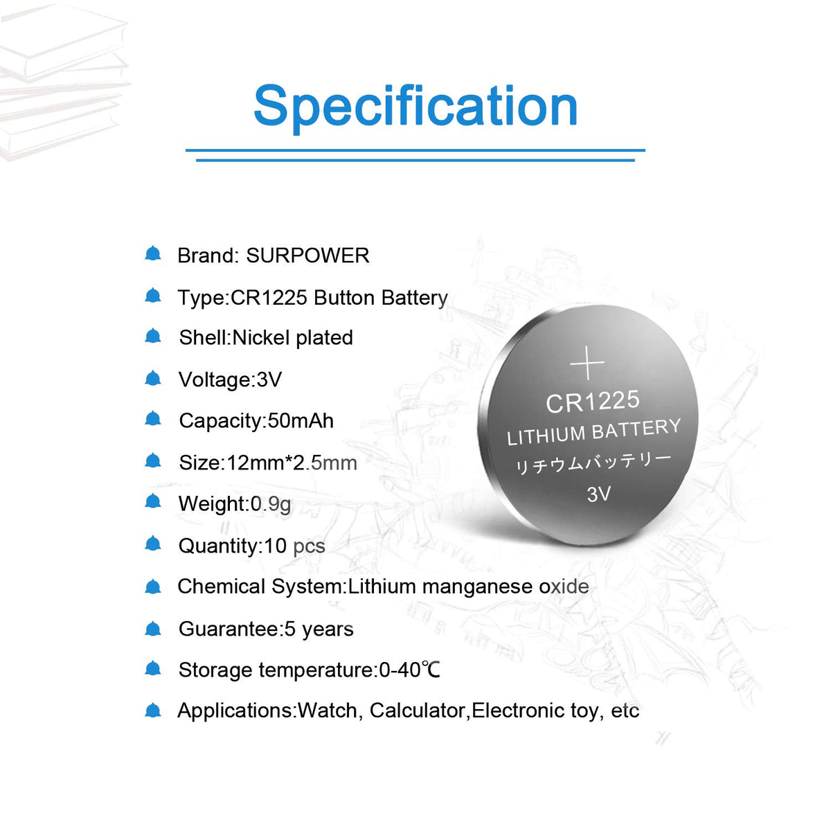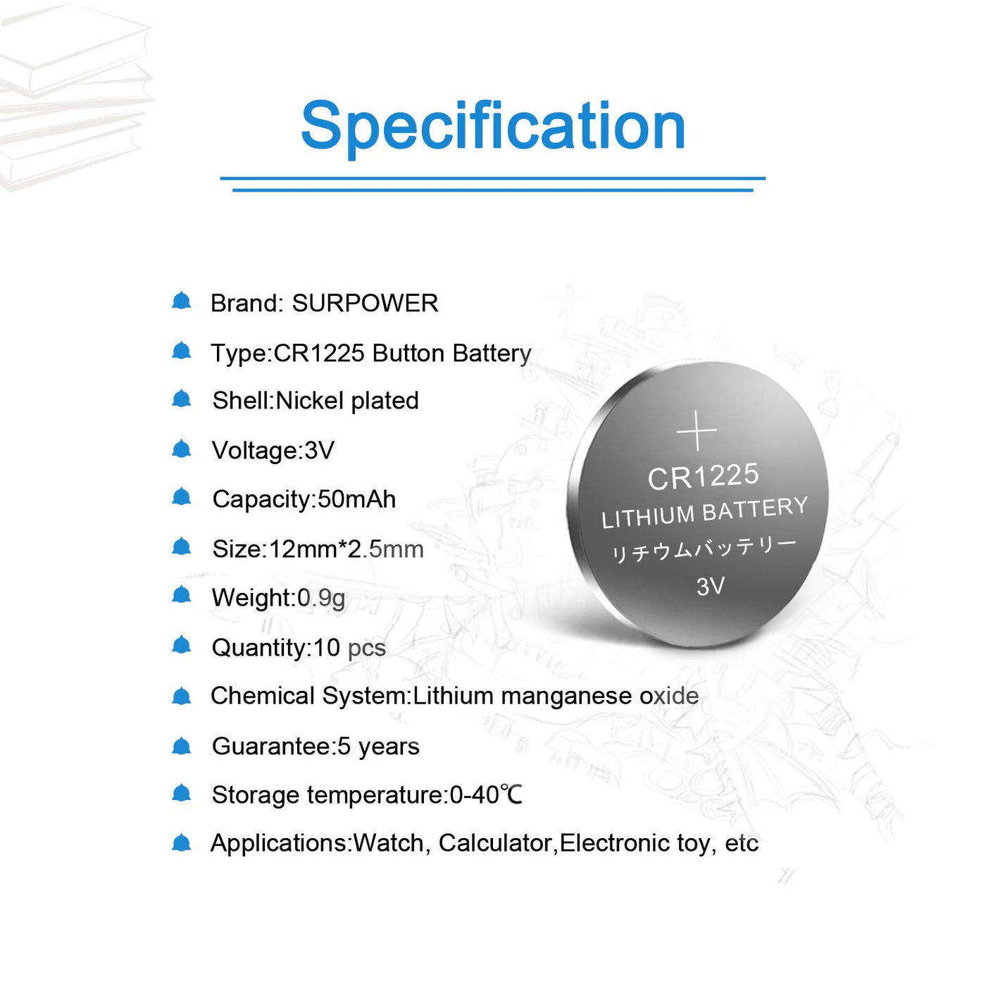Q: How long does the SURPOWER CR1225 battery last?A: The SURPOWER CR1225 battery typically has a shelf life of up to 5 years, ensuring reliable performance for your devices when needed.