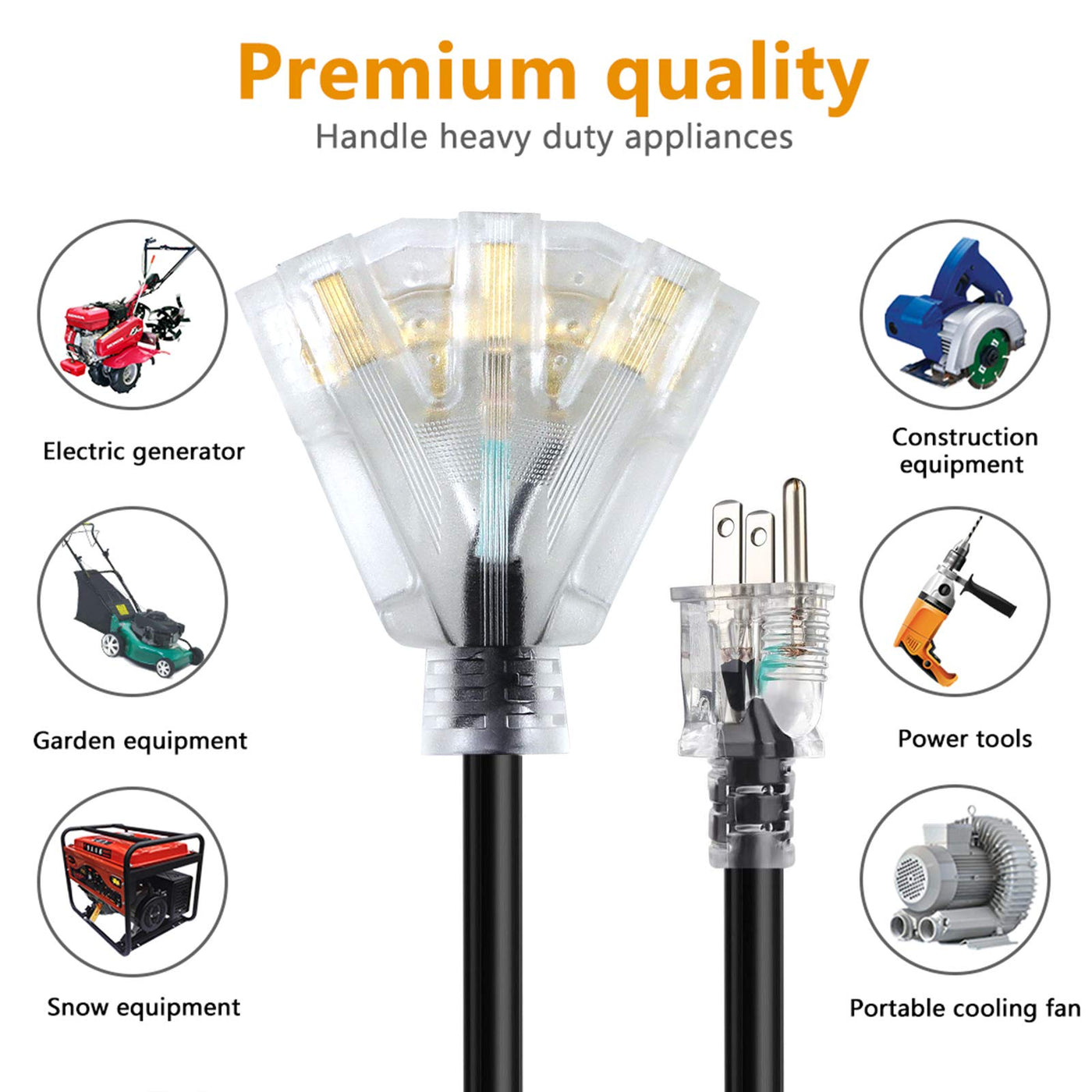 50 Ft 12/3 Extension Cord Heavy Duty Black 3 Outlet Indoor/Outdoor Sjtw Lighted 12 Gauge Grounded Power Cable ,12Awg 15 Amp, 187