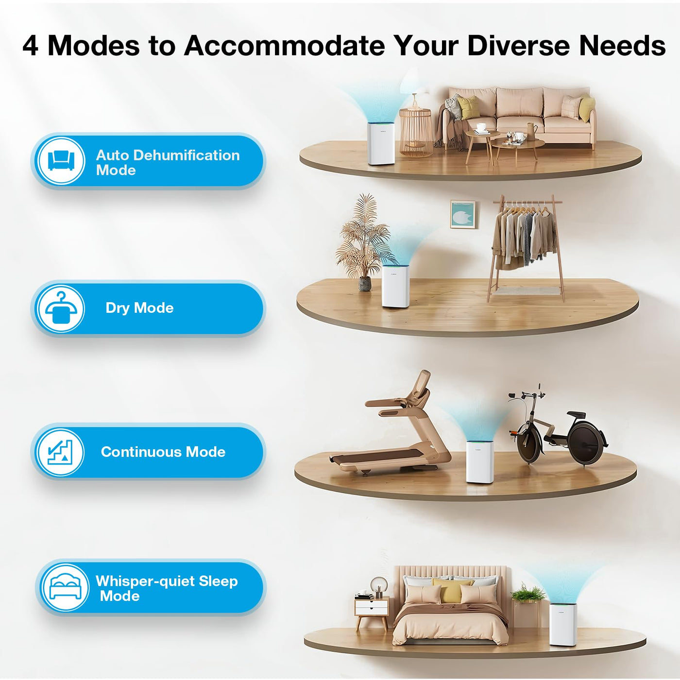Elevate&Nbsp;Your&Nbsp;Home&Nbsp;Comfort&Nbsp;With&Nbsp;Our&Nbsp;State-Of-The-Art&Nbsp;Dehumidifier,&Nbsp;Designed&Nbsp;To&Nbsp;Provide&Nbsp;An&Nbsp;Unmatched&Nbsp;Solution&Nbsp;For&Nbsp;Enhancing&Nbsp;Your&Nbsp;Living&Nbsp;Environment.&Nbsp;Whether&Nbsp;You&Nbsp;Have&Nbsp;A&Nbsp;Large&Nbsp;Room&Nbsp;Up&Nbsp;To&Nbsp;5000&Nbsp;Sq.Ft&Nbsp;Or&Nbsp;Specific&Nbsp;Areas&Nbsp;Like&Nbsp;Basements,&Nbsp;Laundry&Nbsp;Rooms,&Nbsp;Bathrooms,&Nbsp;Garages,&Nbsp;Offices,&Nbsp;Or&Nbsp;Rvs,&Nbsp;Our&Nbsp;Advanced&Nbsp;Dehumidifier&Nbsp;Is&Nbsp;Tailored&Nbsp;To&Nbsp;Meet&Nbsp;Your&Nbsp;Needs&Nbsp;And&Nbsp;Exceed&Nbsp;Your&Nbsp;Expectations. With&Nbsp;An&Nbsp;Impressive&Nbsp;Maximum&Nbsp;Dehumidification&Nbsp;Capacity&Nbsp;Of&Nbsp;52&Nbsp;Pints&Nbsp;Per&Nbsp;Day,&Nbsp;Our&Nbsp;Dehumidifier&Nbsp;Ensures&Nbsp;Optimal&Nbsp;Moisture&Nbsp;Control&Nbsp;And&Nbsp;Creates&Nbsp;A&Nbsp;More&Nbsp;Comfortable&Nbsp;Atmosphere.&Nbsp;It&Nbsp;Effectively&Nbsp;Removes&Nbsp;Excess&Nbsp;Humidity&Nbsp;While&Nbsp;Improving&Nbsp;Indoor&Nbsp;Air&Nbsp;Quality. No&Nbsp;More&Nbsp;Hassle&Nbsp;Of&Nbsp;Constantly&Nbsp;Emptying&Nbsp;The&Nbsp;Water&Nbsp;Tank.&Nbsp;Our&Nbsp;Dehumidifier&Nbsp;Features&Nbsp;A&Nbsp;Spacious&Nbsp;2.5L&Nbsp;(0.66&Nbsp;Gallon)&Nbsp;Water&Nbsp;Tank&Nbsp;That&Nbsp;Automatically&Nbsp;Shuts&Nbsp;Off&Nbsp;When&Nbsp;Full,&Nbsp;Preventing&Nbsp;Any&Nbsp;Potential&Nbsp;Overflow.&Nbsp;For&Nbsp;Added&Nbsp;Convenience,&Nbsp;It&Nbsp;Also&Nbsp;Offers&Nbsp;Continuous&Nbsp;Drainage&Nbsp;With&Nbsp;The&Nbsp;Included&Nbsp;Drain&Nbsp;Hose,&Nbsp;Ensuring&Nbsp;Uninterrupted&Nbsp;Operation. Versatility&Nbsp;Is&Nbsp;Key,&Nbsp;And&Nbsp;Our&Nbsp;Dehumidifier&Nbsp;Provides 4 Smart&Nbsp;Modes&Nbsp;To&Nbsp;Cater&Nbsp;To&Nbsp;Your&Nbsp;Specific&Nbsp;Needs.&Nbsp;The&Nbsp;Dehu&Nbsp;Mode&Nbsp;Intelligently&Nbsp;Starts&Nbsp;And&Nbsp;Stops&Nbsp;Based&Nbsp;On&Nbsp;Your&Nbsp;Pre-Set&Nbsp;Humidity&Nbsp;Level,&Nbsp;Maintaining&Nbsp;Optimal&Nbsp;Humidity&Nbsp;In&Nbsp;Your&Nbsp;Living&Nbsp;Room.&Nbsp;The&Nbsp;Dry&Nbsp;Mode&Nbsp;Enables&Nbsp;Quick&Nbsp;Drying&Nbsp;Of&Nbsp;Delicate&Nbsp;Clothing,&Nbsp;While&Nbsp;The&Nbsp;Cont&Nbsp;Mode&Nbsp;Effectively&Nbsp;Manages&Nbsp;Persistently&Nbsp;Moist&Nbsp;Areas.&Nbsp;Additionally,&Nbsp;The&Nbsp;Sleep&Nbsp;Mode&Nbsp;Ensures&Nbsp;Silent&Nbsp;Operation&Nbsp;For&Nbsp;A&Nbsp;Peaceful&Nbsp;Sleep&Nbsp;Environment.
