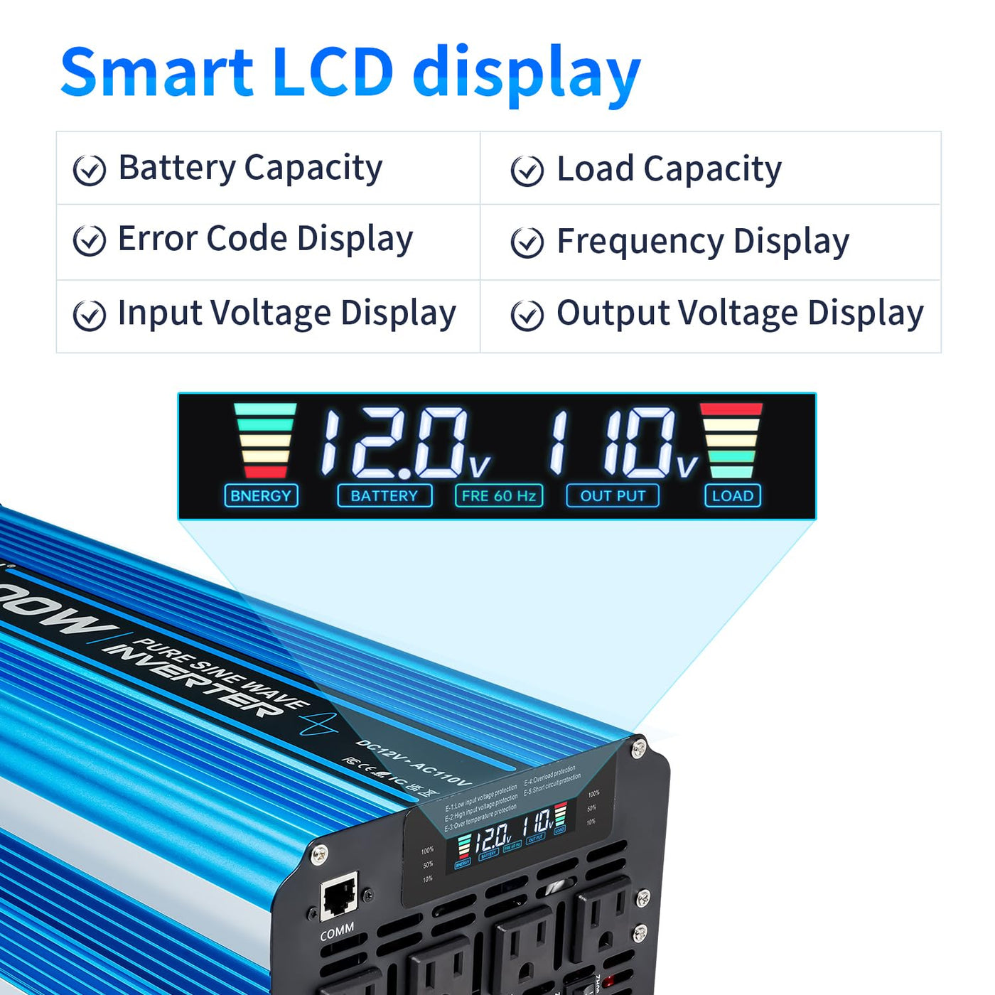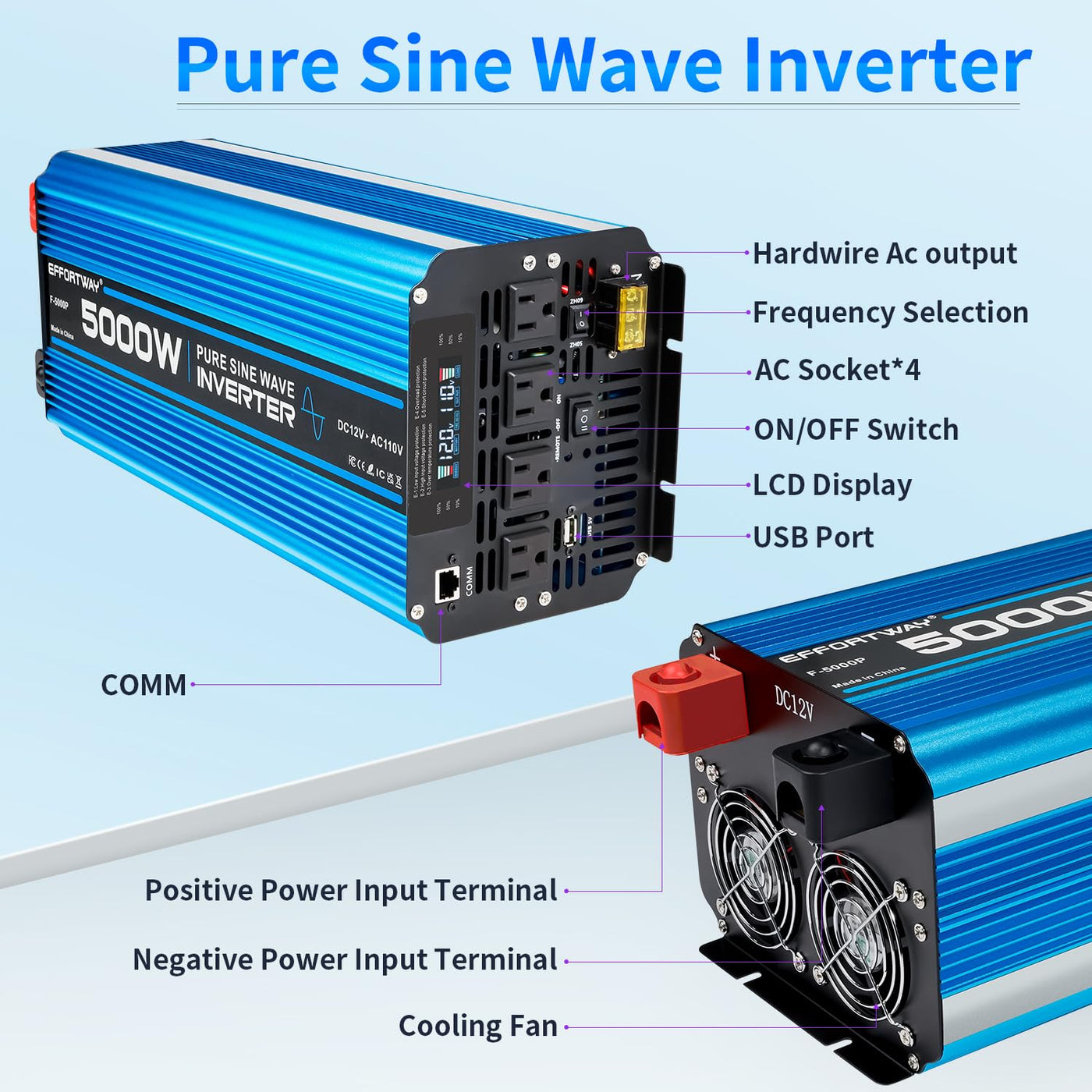 The Effortway 5000W Pure Sine Inverter Is A Reliable And Powerful Solution For Converting Dc 12V Power From Your Vehicle Or Solar Battery Into Ac 110V/120V Electricity. This Heavy-Duty Inverter Allows You To Power Various Household Appliances And Electronics While On The Go, Making It Perfect For Rvs, Motorhomes, Trucks, And Off-Grid Applications. With 4 Ac Outlets 4 Usb Ports And Hardwired Ac, You Can Simultaneously Charge Multiple Devices. The Lcd Display Provides Real-Time Monitoring Of Voltage, Wattage, And Battery Level. The Wireless Remote Control Adds Convenience, Allowing You To Operate The Inverter From A Distance. Designed With Safety In Mind, This Inverter Features Overload, Over-Voltage, And Short-Circuit Protection. Its Sturdy Metal Housing Ensures Durability And Efficient Heat Dissipation. Upgrade Your Mobile Power Needs With This Versatile And High-Performance Inverter.