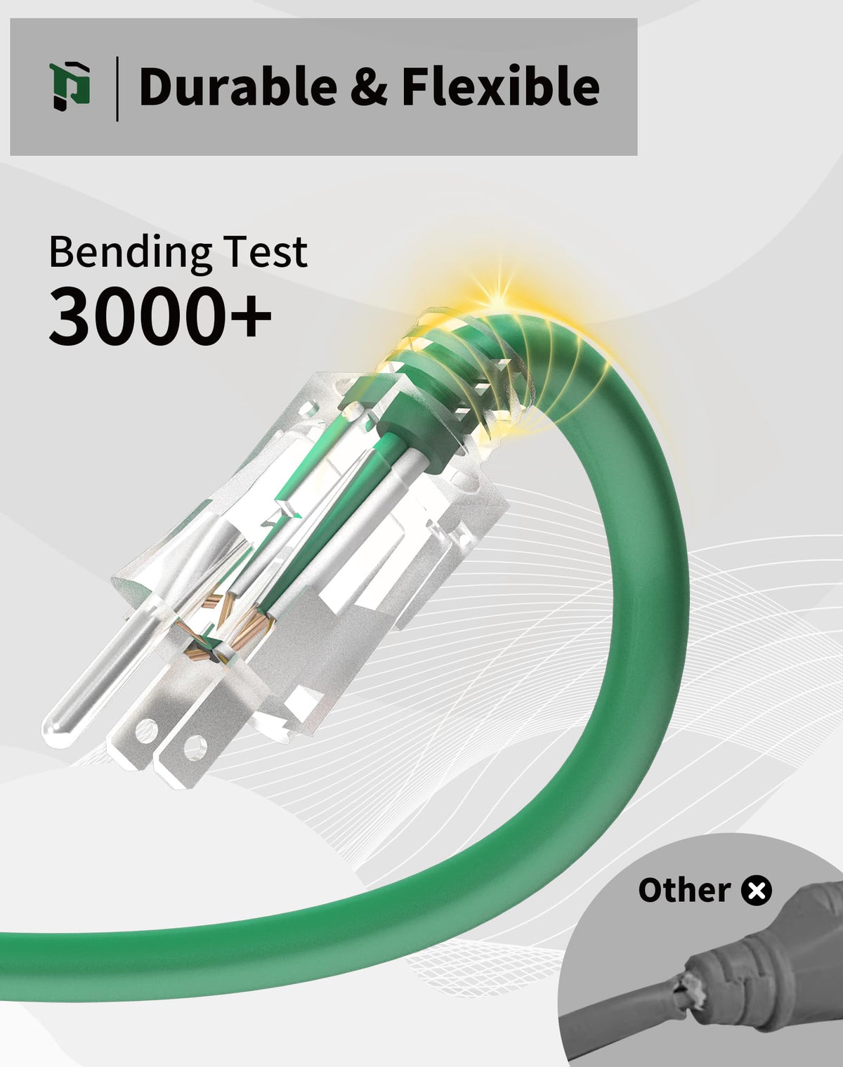 Q: What is the construction material of the extension cord, and is it durable?A: The extension cord is made of heavy-duty 12-gauge copper wire conductors, ensuring durability and efficient power delivery for both indoor and outdoor applications.