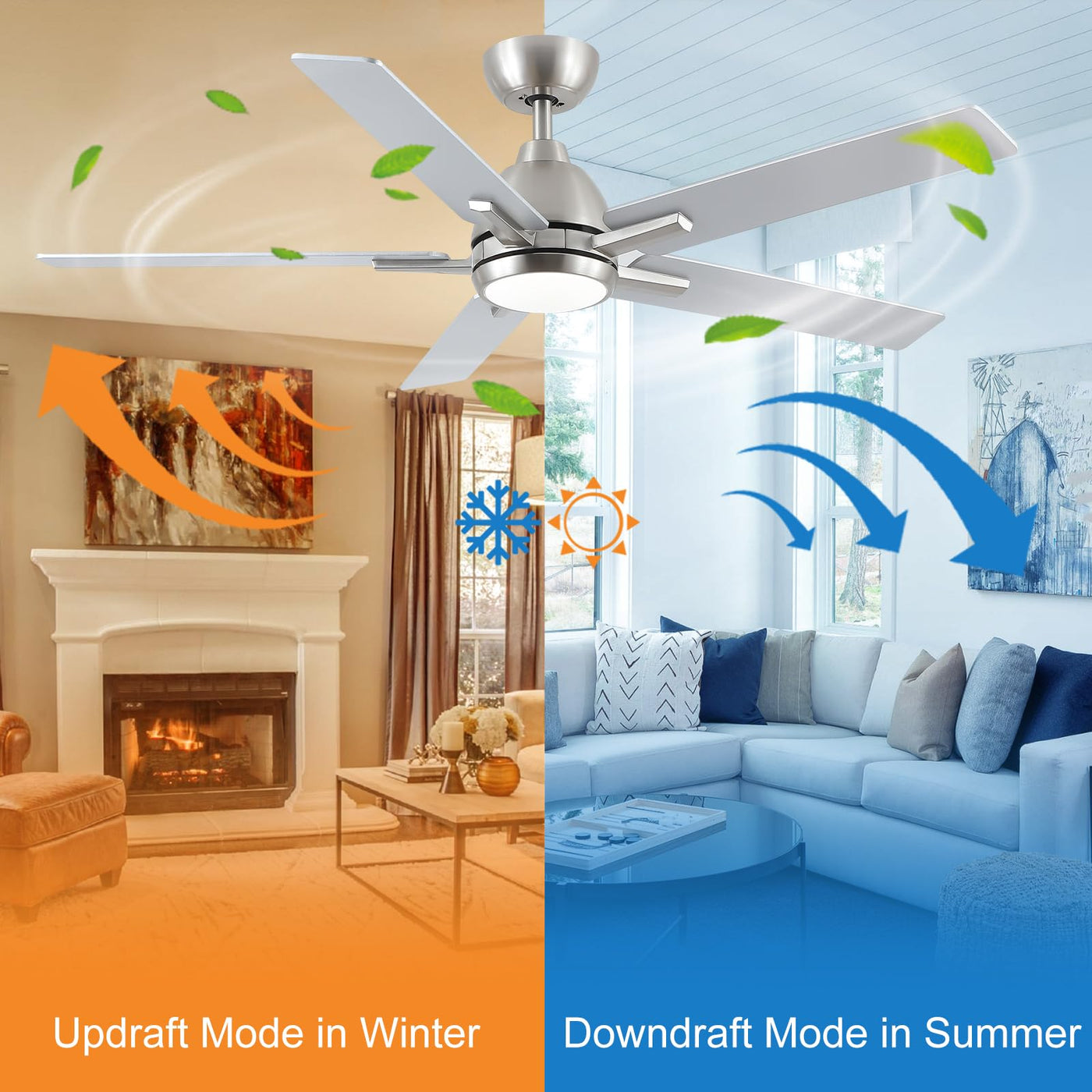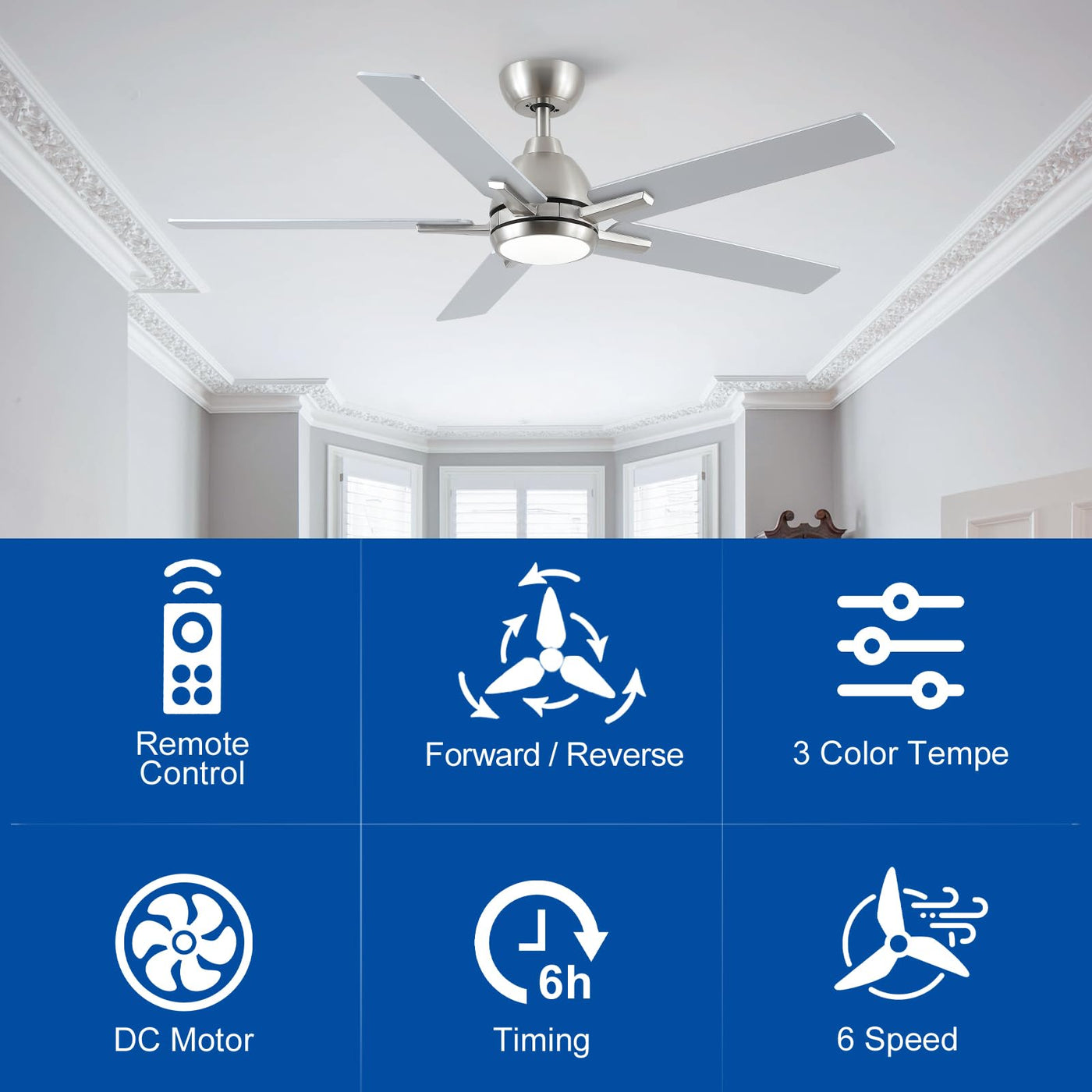 52 Inch Ceiling Fans With Lights And Remote,Brushed Nickel Ceiling Fan With 5 Dual Sided Blades,Downrod,6 Speed Reversible Dc Mo