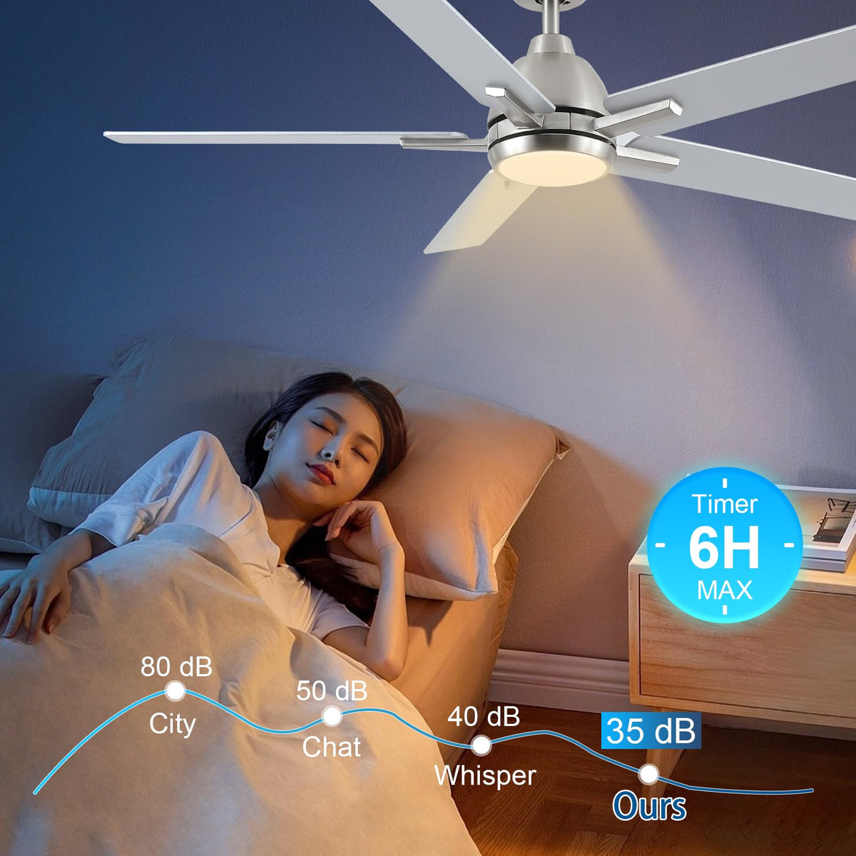 Q: What are the speed settings available on the Sevenine ceiling fan?A: The fan offers six speed settings, allowing you to choose from soft, natural, and cooling modes, easily adjustable through the included remote control.