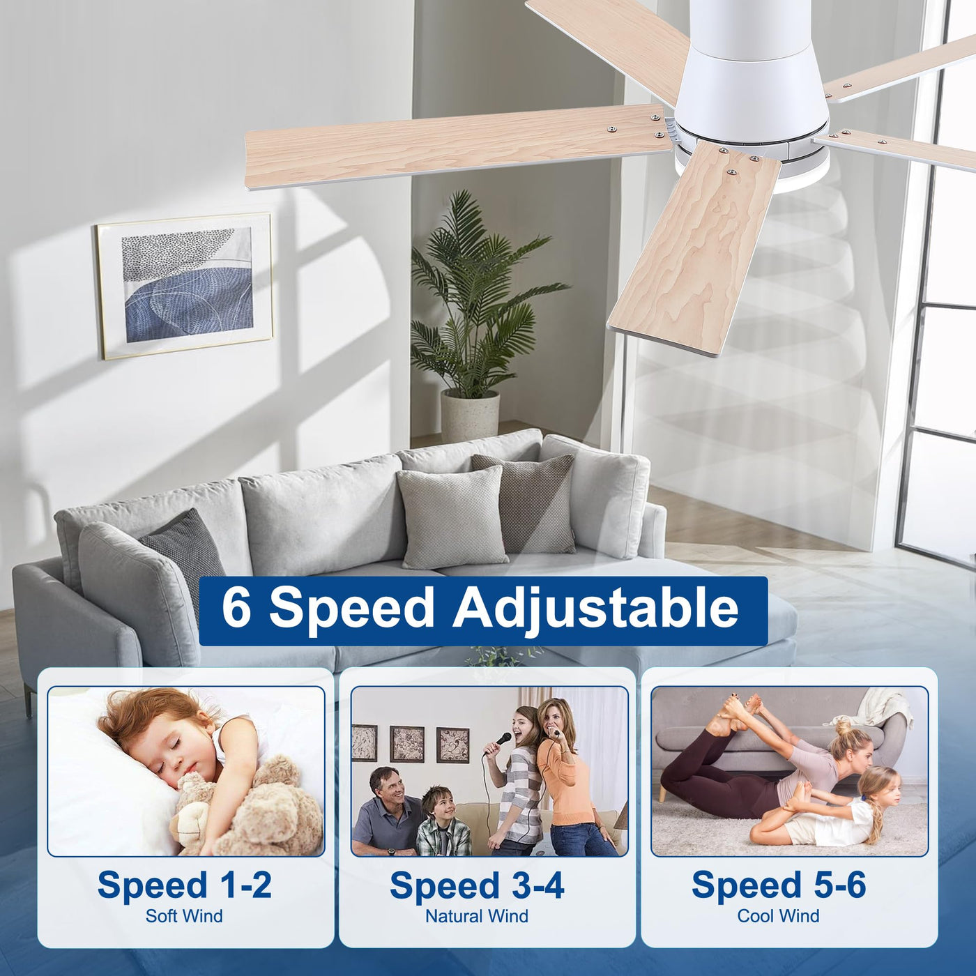 52 Inch Ceiling Fans With Lights And Remote,Flush Mount White Ceiling Fan With 5 Blades,6 Speed Reversible Dc Motor,3Cct Dimmabl