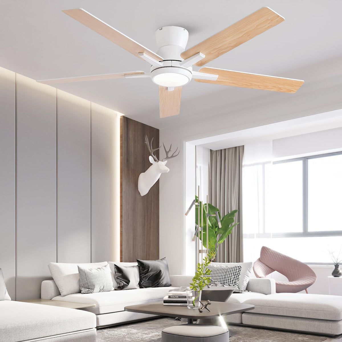 52 Inch Ceiling Fan With Light,5 Blades Double-Colored,Flush Mount,6 Speed Adjustable Remote Control,24W Dimmable Led,1/3/6 Hours Timer,Reversible Dc Motor, Low Profile For Patio Living Room Bedroom Dining Room Warehouse