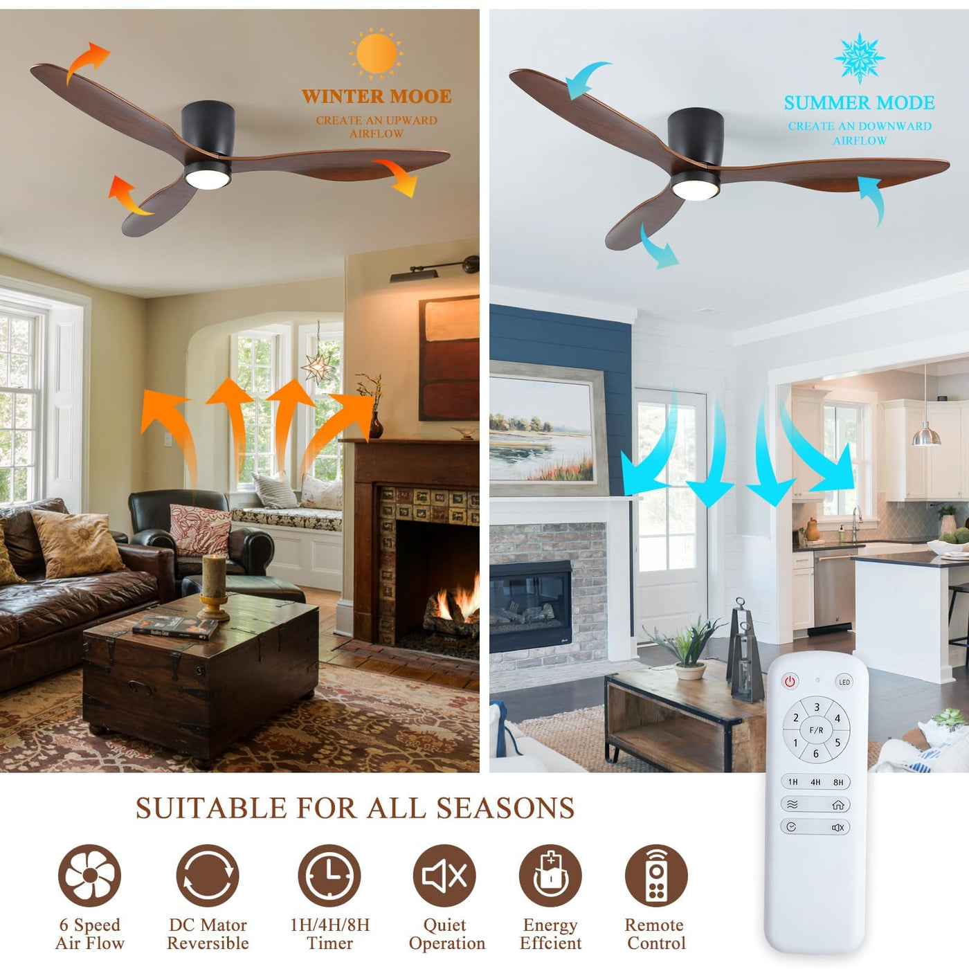 52 Inch Low Profile Ceiling Fan With Lights, Flush Mount Ceiling Fan, 3 Wood Blades, Noiseless Dc Motor Timer Function, 6 Adju