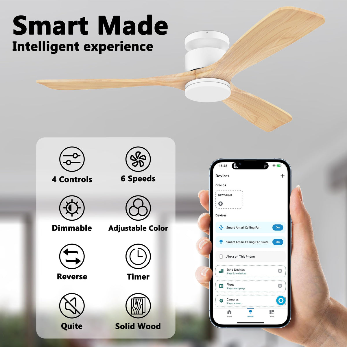 Transform Your Living Space With Our Cutting-Edge Smart Ceiling Fan With Lights And Remote Control. Engineered For Modern Convenience And Style, This 52-Inch Low Profile Flush Mount Ceiling Fan In Solid Wood White And Light Wood Color Provides Both Functionality And Aesthetics, Suitable For Indoor Outdoor Places, Like Bedroom,Living Room,Kitchen,Patios And Porch. Stay In Total Control With Our Integrated Smart Technology. Compatible With Wifi, Alexa, Google Assistant And App, You Can Adjust Fan Speeds And Lighting Effortlessly With Simple Voice Commands Or Through The Intuitive Smartphone App. Plus, Even If Your Wifi Connection Is Down, You Can Still Enjoy Full Control Thanks To The Included Remote Control. Illuminate Your Home With Dimmable And Color-Changing Led Lighting. Installation Is Easy To Do. And The Low-Profile Design Makes It Ideal For Flush Mounting On Low Ceilings. Plus, With Its Whisper-Quiet Dc Motor, You Can Enjoy A Powerful Airflow Without The Distraction Of Noise, Perfect For Light Sleepers. Upgrade Your Home Today With The Ultimate Combination Of Comfort, Convenience, And Style. Add Our Smart Ceiling Fan With Lights To Your Cart Now And Experience The Future Of Home Living.