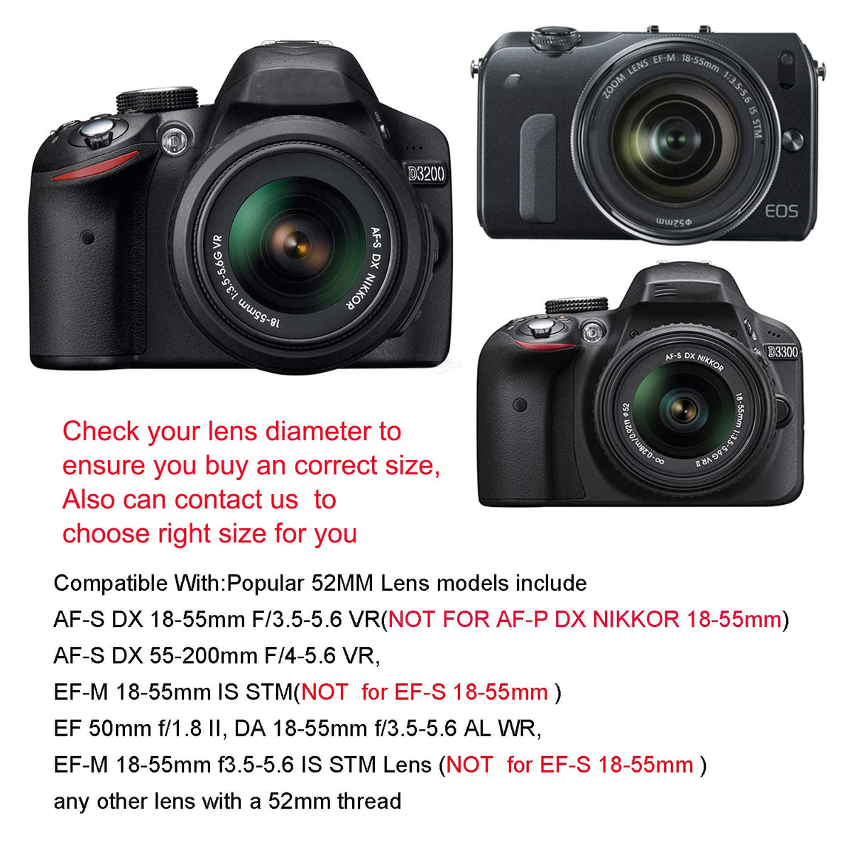 Compatible With:Popular 52Mm Lens Models Include Nikon Af-S Dx 18-55Mm F/3.5-5.6 Vr, Af-S Dx 55-200Mm F/4-5.6 Vr, Canon Ef-M 18-55Mm Is Stm, Canon Ef 50Mm F/1.8 Ii, Pentax Da 18-55Mm F/3.5-5.6 Al Wr, Canon Ef-M 18-55Mm F3.5-5.6 Is Stm Compact System Lens.Camera Models: Nikon Dslr (D3300 D3200 D3100 D5500 D5300 D5200 D5100), Canon Eos M3 Mirrorless Camera Kit With Ef-M 18-55Mm Image Stabilization (Is) Stm Lens Package Contains:- 52Mm Reversible Tulip Flower Lens Hood X 1Pcs;- 52Mm Collapsible Rubber Lens Hood X 1Pcs;- 52Mm Center Pinch Lens Cap X 1Set;- 6''X7'' Microfiber Cleaning Cloth X 1Pcs; 52Mm Rubber Lens Hood- Rubber Lens Hoods Provide Extra Protection From Accidental Bumps Or Scratches Thanks To High Quality Shock Absorbent Rubber.- The Addition Of A Lens Hood Can Help Prevent Flares-Those Circles Of Light That Can Accompany Images Where A Strong Light Source Is Just Outside The Frame.- 3-In-1 Collapsible Design, Extend To Full Length For Use With A Telephoto Lens, Collapse Midway For Wide Angle Shots, Collapse Completely For Macro Photography Or Easy And Compact Storage- Features A Metal Ring Screw Mount For Easy Attachment To Your Lens Or Filter. Specially Designed For A Tight And Secure Fit. No Wobbling Or Cross-Threading.- Double Threaded Screw Mount Also Allows You To Attach Lens Caps, Filters, Or Other Accessories On The Hood Itself Without The Need To Remove The Hood First. 52Mm Reversible Camera Lens Hood- Professional Tulip Shape Design (Also Known As Flower Or Petal Shape) Allows For Greater Versatility. Perfect For Standard Or Zoom Lenses.- Unique Design For Quickly Detaching And Mounting. Normal Mode And Reverse Mode For Using.- Easy To Use Screw Mount Lens Hood Screws Right Onto Your Lens Or Filter.- Features A Rear Locking Ring To Allow User To Rotate The Hood In Either Direction And Capture The Exact Amount Of Shading Desired.