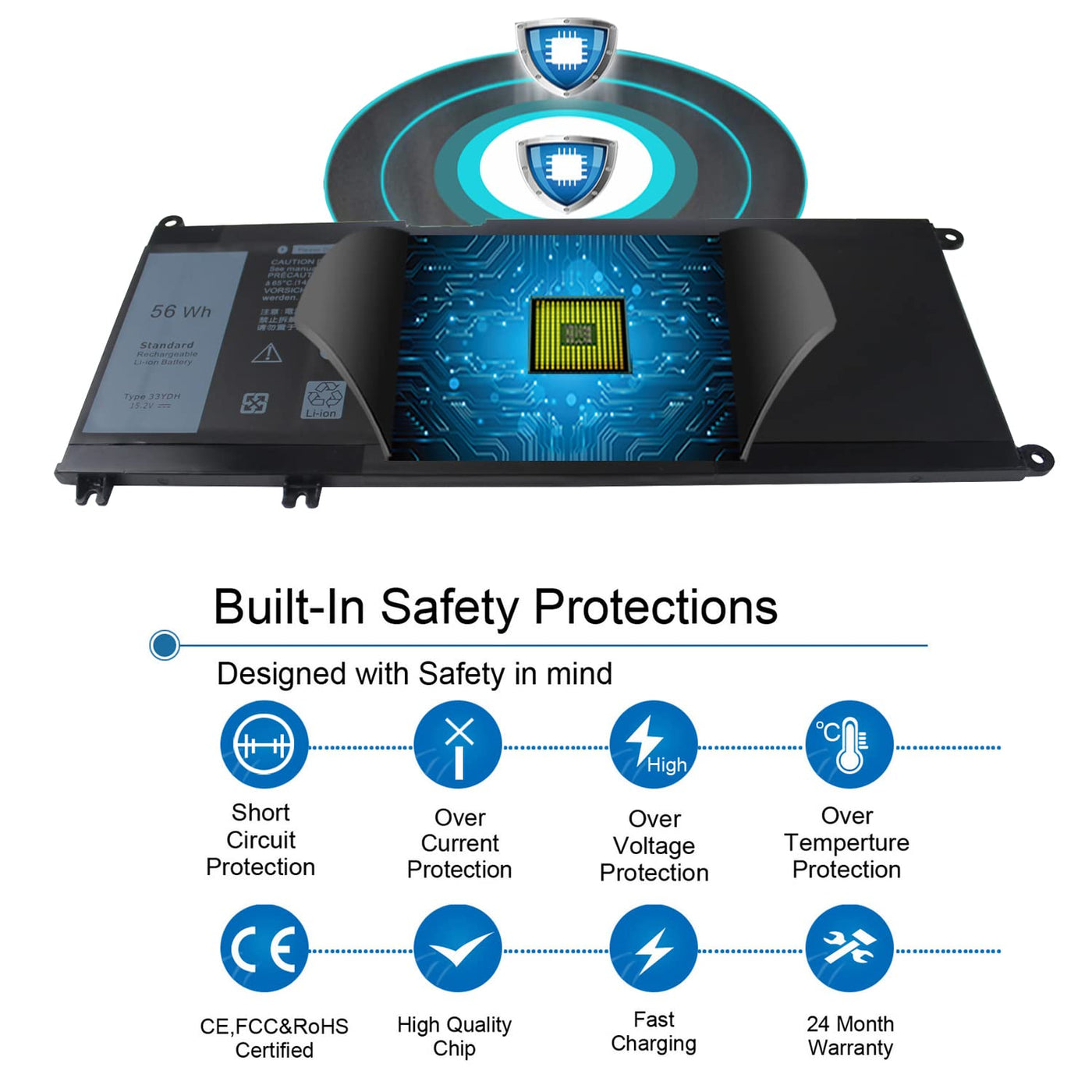 Q: What safety features does this battery have?A: The 33YDH Laptop Battery includes several safety features such as overcharge and overdischarge circuit protection, over-temperature and short-circuit protection. These features are designed to ensure safe usage and extend the battery's longevity.