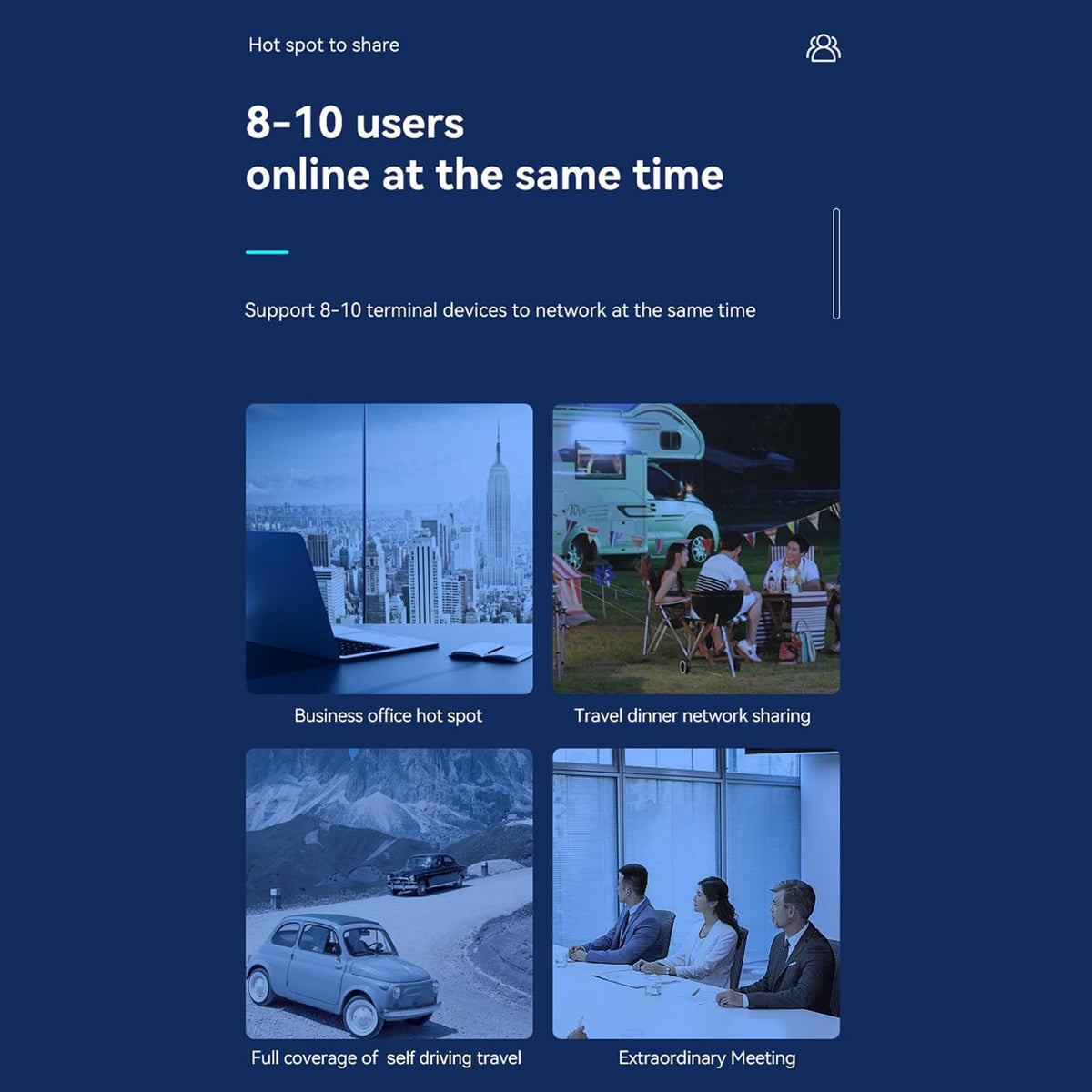 Spec: Item Type: Router Material: Abs Color: Black Size: Approx. 100 X 60 X 32Mm / 3.9 X 2.4 X 1.3In Battery: Lithium Ion Battery (Built In) Capacity: 10000Mah Wifi Protocol: Wifi 802.11G, Wifi 802.11B, Wifi 802.11N Frequency Band: Fdd Lte: 1, 3, 5, 7, 8, 20, 28 Tdd Lte: 38, 40, 41 Wcdma: 1, 5, 8 Share: Maximum 10 Users Interface: Usb, Usb C Sim Card Slot: 1 X Standard Sim Card Slot (Sim Card Not Included)