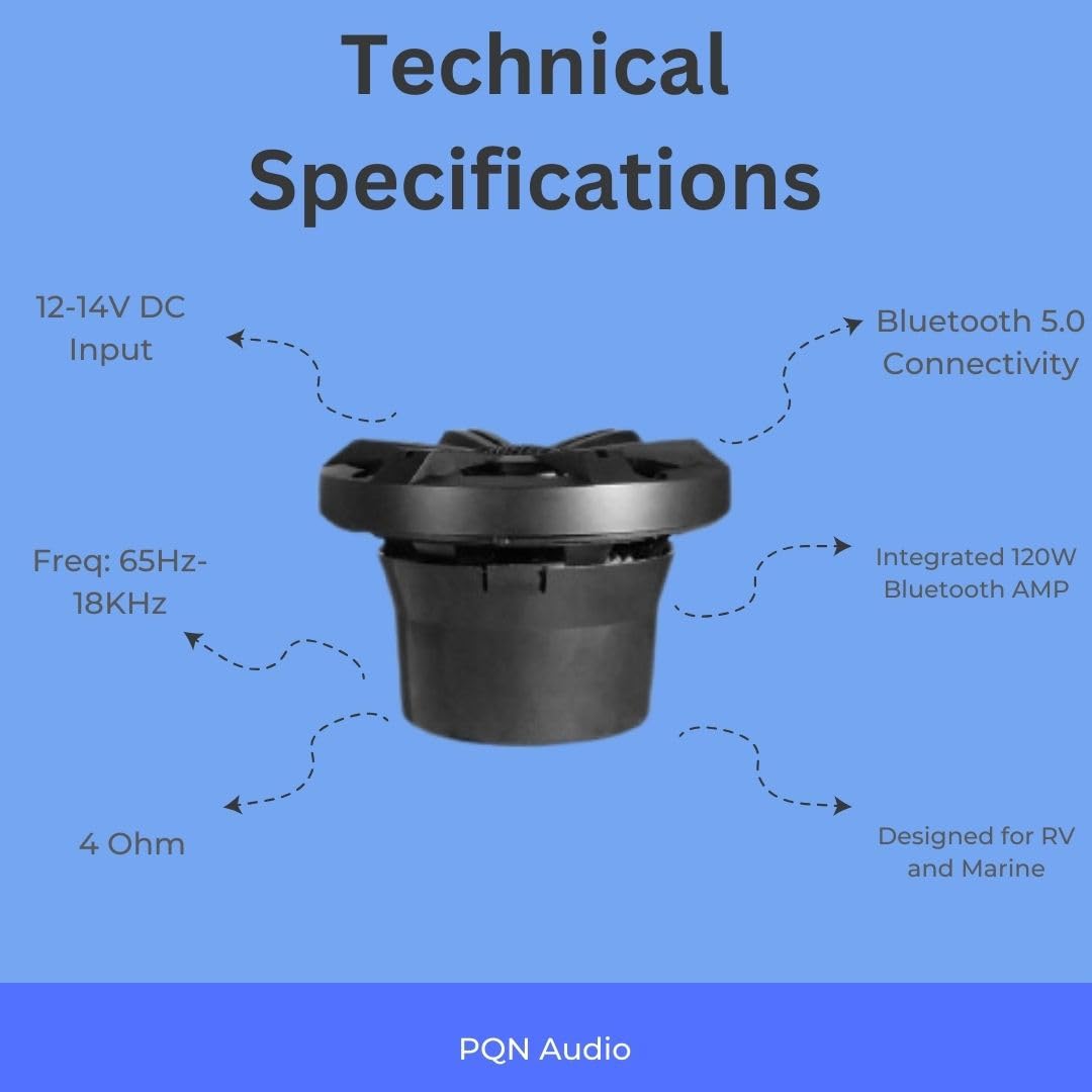 Q: Are the PQN Audio RV652BTWLD speakers suitable for marine use?A: Yes, the PQN Audio RV652BTWLD speakers are designed specifically for marine environments, featuring a waterproof design with an IP66 rating, making them ideal for use on boats and in harsh outdoor conditions.