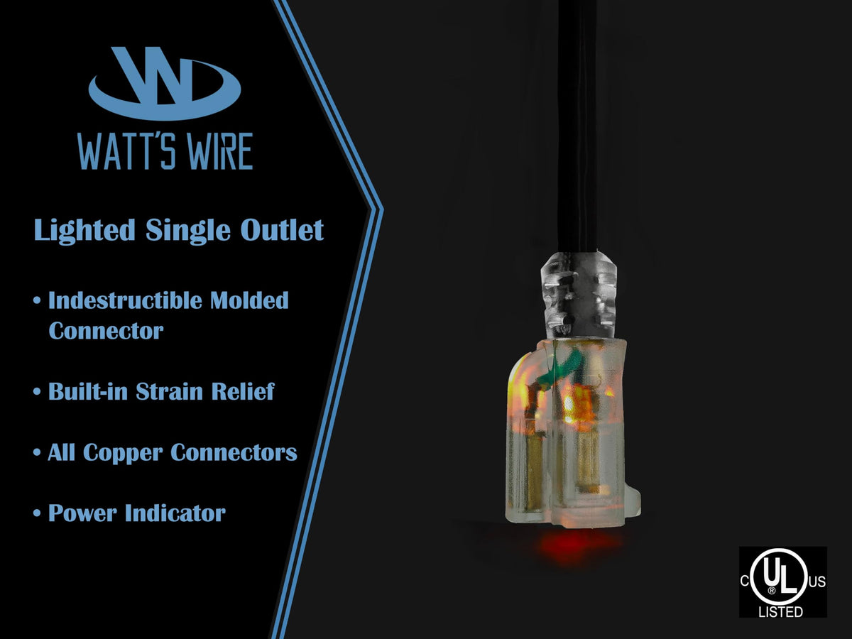 Watt'S Wire 12Awg 6 Foot Indoor/Outdoor Heavy Duty Lighted Sjtw Extension Cordour Lighted Power Cords Are The Perfect Power Cord For All Around Use. Our Power Cords Are Designed Around The Contractor And Are Perfect For The Hobbyist. All Of Our Cords Are Heavy Gauge Copper Conductors Designed To Minimize Voltage Drop And Meet A Full 15 Amps Or 1875 Watts. These Are The Best Cords You Will Find!Why Choose Our Product Over Our Competitors?Double Jacketed Cable With Multiple Outlets Rated To 125Vac 15Amp And 1875Watt.12 Awg Heavy Copper Conductors Minimizing Voltage Drop And Getting Power Where You Need It.Abrasion Resistant Indoor/Outdoor Thermoplastic Jacket That Will Stand Up To Concrete, But Not Mar Your Floors Or Walls.Built In Power Indicator Light To Assist In Nighttime Use Or Circuit Troubleshooting.Designed To Osha Standards For Indoor/Outdoor Use And Certified Under The Ul Listing.Corrosion, Fire And Moisture Resistant, With Built-In Strain Relief, And Unbreakable Nema 5-15 Molded Plugs.Lifetime Warranty Against Manufacturer Defects.We Stand By Our Products. We Offer A No Questions Asked 30-Day Money Back Guarantee. If You Are Unhappy For Any Reason In The First 30 Days, Return The Item For A Full Refund! In Addition To This, We Offer A Limited Lifetime Warranty. If Your Cord Fails Due To A Manufacturing Defect, Return It To Us For A Free Replacement.