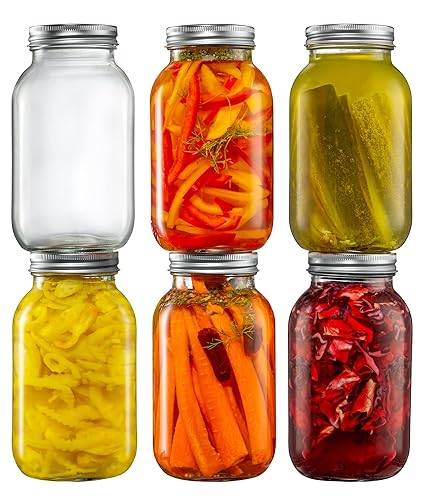 6 Pack] 32 Oz Regular Mouth Glass Mason Jars With Metal Airtight Lids And Bands 1 Quart Large For Canning, Preserving, Meal P