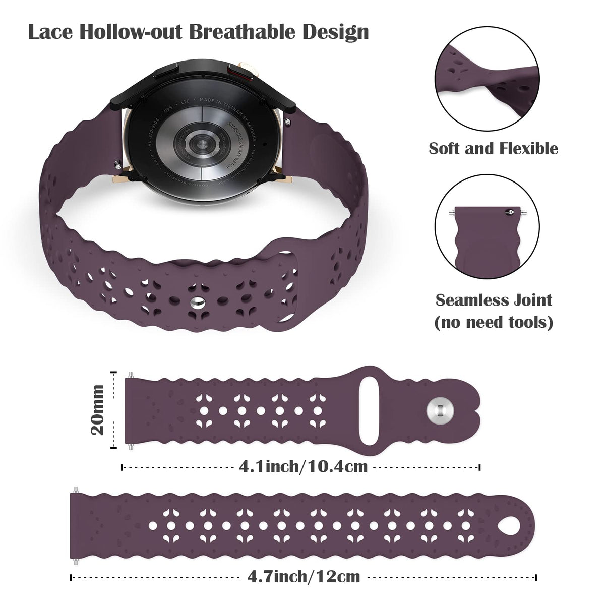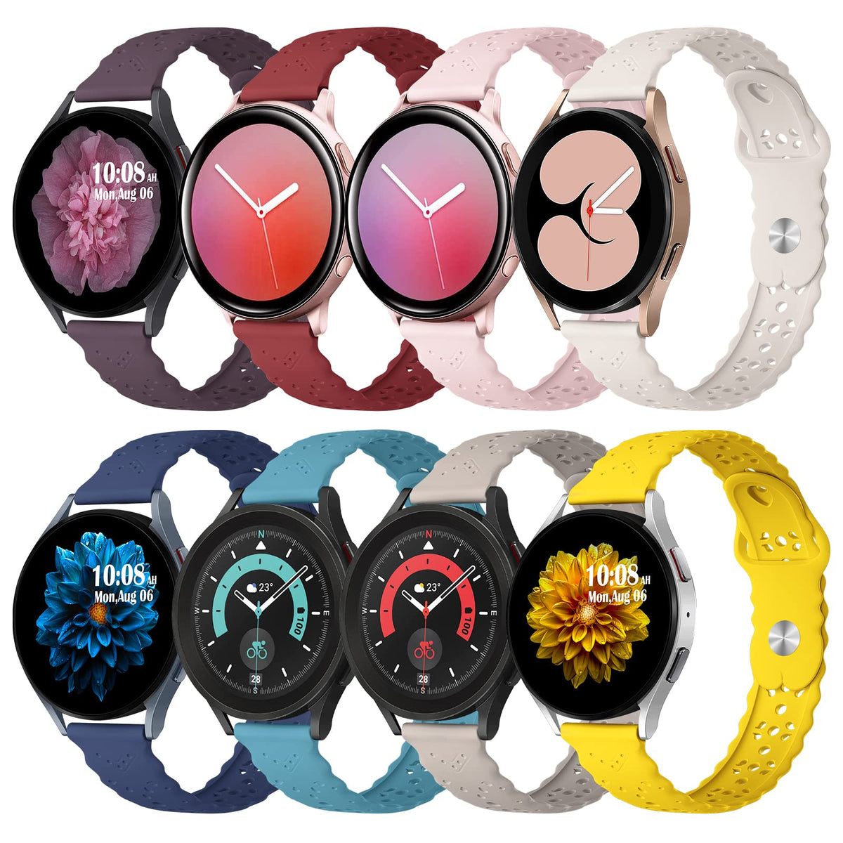 Q: Which Samsung Galaxy Watch models are compatible with these bands?A: These bands are compatible with various Samsung Galaxy Watch models including the Galaxy Watch 5 (40mm/44mm), Galaxy Watch 5 Pro (45mm), Galaxy Watch 4 (40mm/44mm), Galaxy Watch 4 Classic (42mm/46mm), Galaxy Watch 3 (41mm), Galaxy Active 2 (40mm/44mm), and any smartwatch with 20mm width lugs.