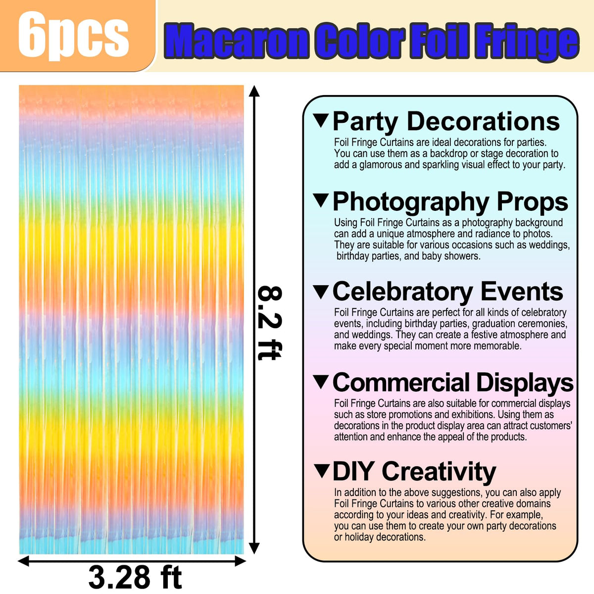 6 Pack Light Raainbow Foil Fringe Curtain Backdrop, 3.28Ft X 8.2Ft Metallic Tinsel Foil Fringe Streamer Curtains For Photo Booth