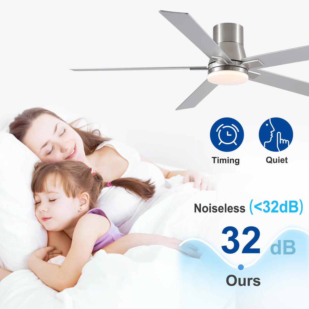 60 Inch Ceiling Fans With Lights And Remote,Flush Mount Silver Ceiling Fan With 5 Blades,6 Speed Reversible Dc Motor,3Cct Dimmab