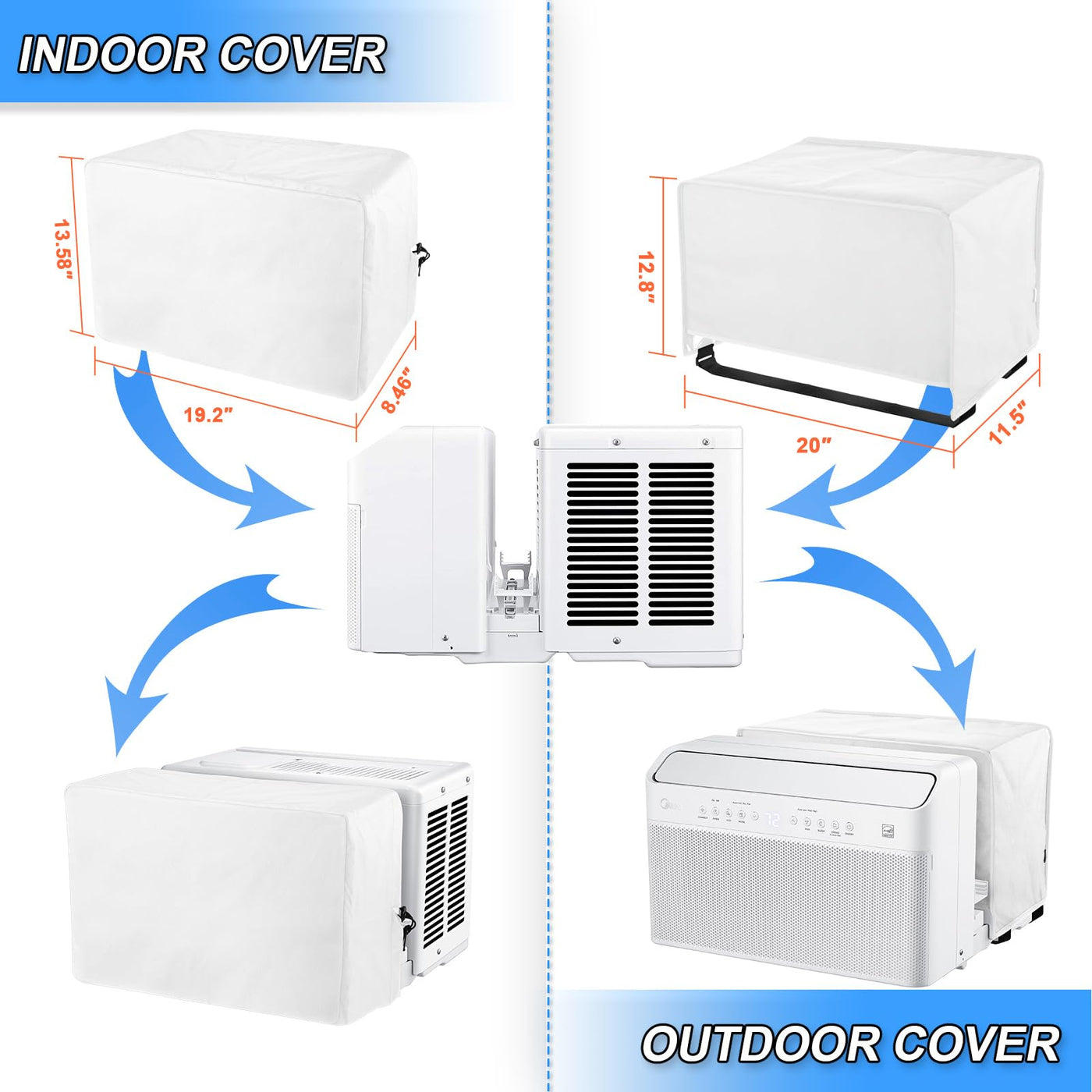 Q: What sizes of air conditioners does this cover fit?A: This air conditioner cover is designed to fit most U-Shaped window air conditioners with BTU ratings between 8000 to 12000. The outdoor cover measures 20 x 12.8 x 11.5 inches, while the indoor cover measures 19.2 x 13.58 x 8.46 inches. Be sure to measure your AC unit before purchasing to ensure a proper fit.