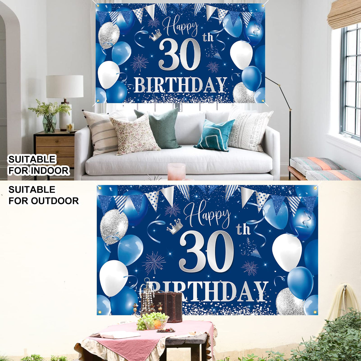 Q: How do I hang the birthday banner for my event?A: The banner is easy to install and comes equipped with a rope. Simply attach it through the 4 holes at the corners and hang it on a wall, window, photo booth, or fence to enhance your party decor.