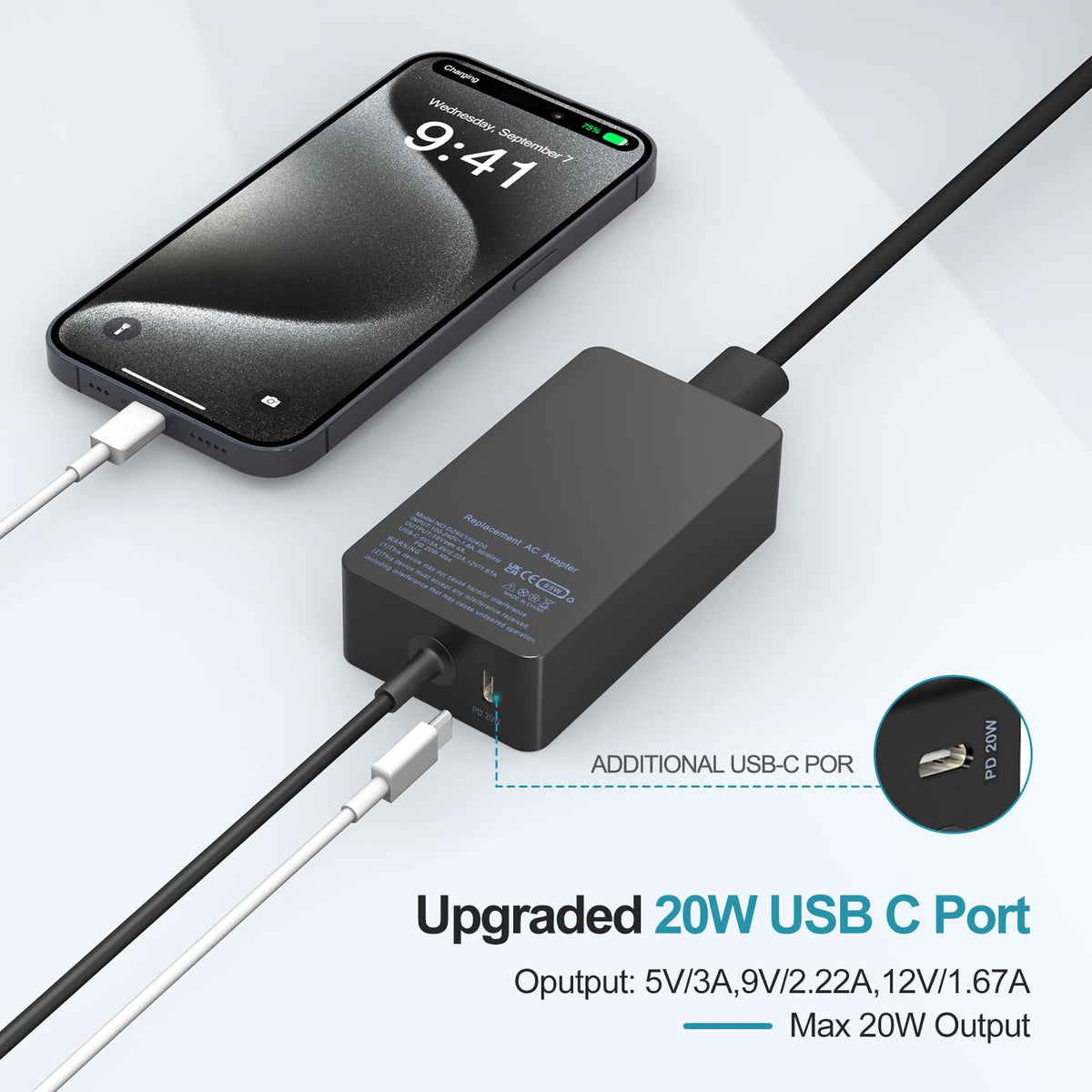Product Specifications: 100% Brand New Input(Ac):100-240V 50/60Hz Output(Dc):15V-4A Usb-C Port:5V/3A,9V/2.22A,12V/1.67A;Pd 20W Max Color:Black Widely Compatible: For Microsoft Windows Series: Surface Pro 9, 8, 7+, 7, 6, 5, 4, 3, X Surface Book 3, 2, 1 Surface Go 3, 2, 1, Surface Laptop Go Surface Laptop 5, 4, 3, 2, 1, Surface Laptop Studio For Cellphone Series: Samsung Galaxy S22, S21, S20, Google Pixel 6, 6 Pro, 5, Lg And So On Ipad Pro 12.9, Ipad Pro 11, Ipad Pro 10.5, Ipad 9, 8, 7, Ipad Air 5, 4, Ipad Mini 6, 5 Iwatch Charger, Airpods, Power Bank, Wireless Charger, Magsafe Charger, Ipad Pen Iphone 14, Iphone 13, 13 Pro, 13 Pro Max, 13 Mini, 12, 12 Pro, 12 Pro Max, 12 Mini, 11, 11 Pro, 11 Pro Max, Xs, Xs Max, Xr, X, Se, 8, 8 Plus