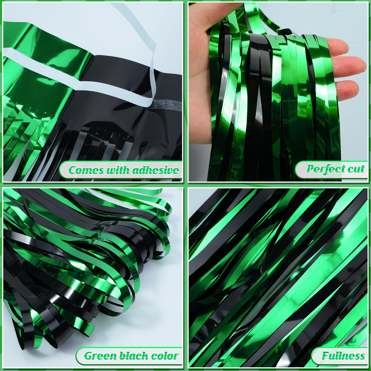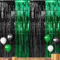 Q: What occasions are these green and black fringe curtains suitable for?A: These decorations are perfect for various occasions, including graduation parties, weddings, birthdays, and any shiny themed events.