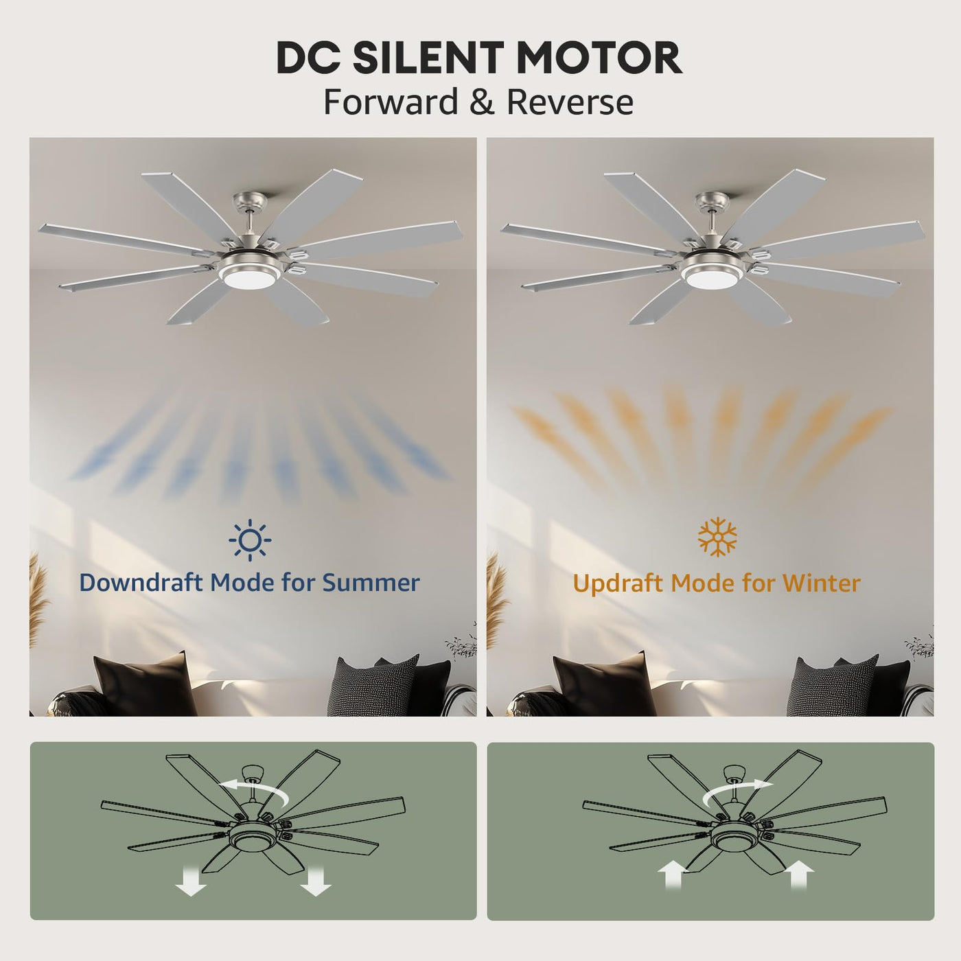 72 Inch Large Ceiling Fans With Lights And Remote Control, Modern Nickel Ceiling Fan With Quiet Reversible Dc Motor, Timer, 6 Sp